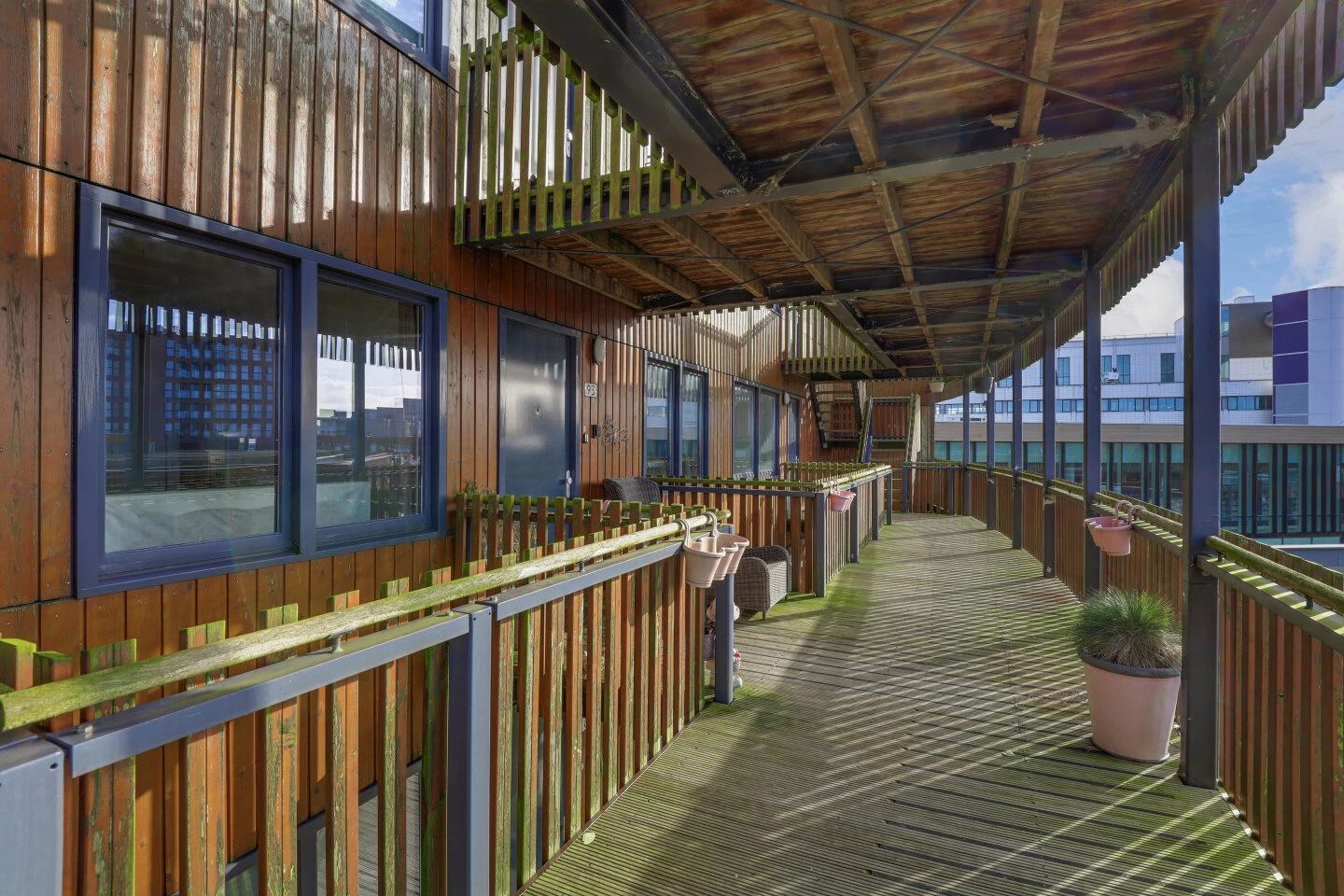 Er is aan de voorzijde van het appartementencomplex op de tweede verdieping toegang tot de gezamenlijke binnentuin, waar je heerlijk kunt genieten van de zon.