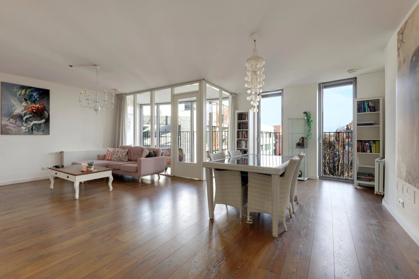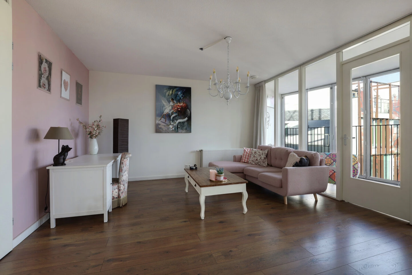 Aan de achterzijde bevindt zich de ruime woonkamer met eetgedeelte, deze is sfeervol ingericht. Enige wat je nog hoeft te doen is de verhuisdozen uit te pakken en je kunt hier zo wonen. Vanuit de woonkamer heb je toegang tot het zogenaamde Franse balkon welke is afgesloten met openslaande deuren en fantastisch uitzicht over het centrum van Lelystad.