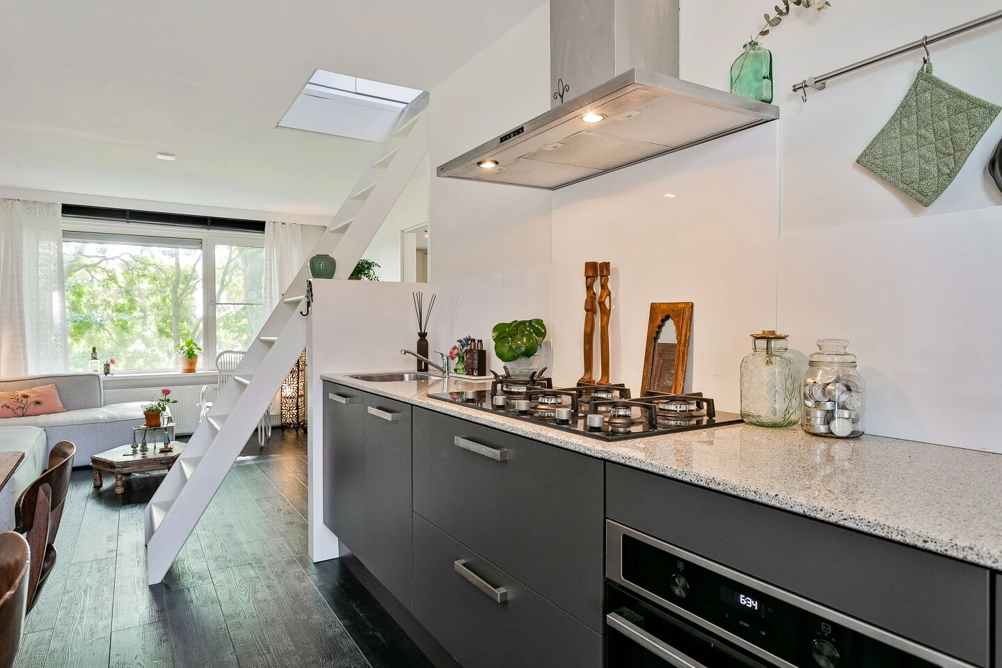 De moderne open keuken is gesitueerd aan de achterzijde van de woning, deze heeft een rechte opstelling, in een grijze kleur en biedt veel werk- en opbergruimte. De keuken is voorzien van alle gemakken, zoals 4 pits gaskookplaat met wok-brander, recirculatie afzuigkap, combimagnetron, koelkast en vaatwasser. Er is voldoende ruimte om een eettafel in de keuken te plaatsen.
