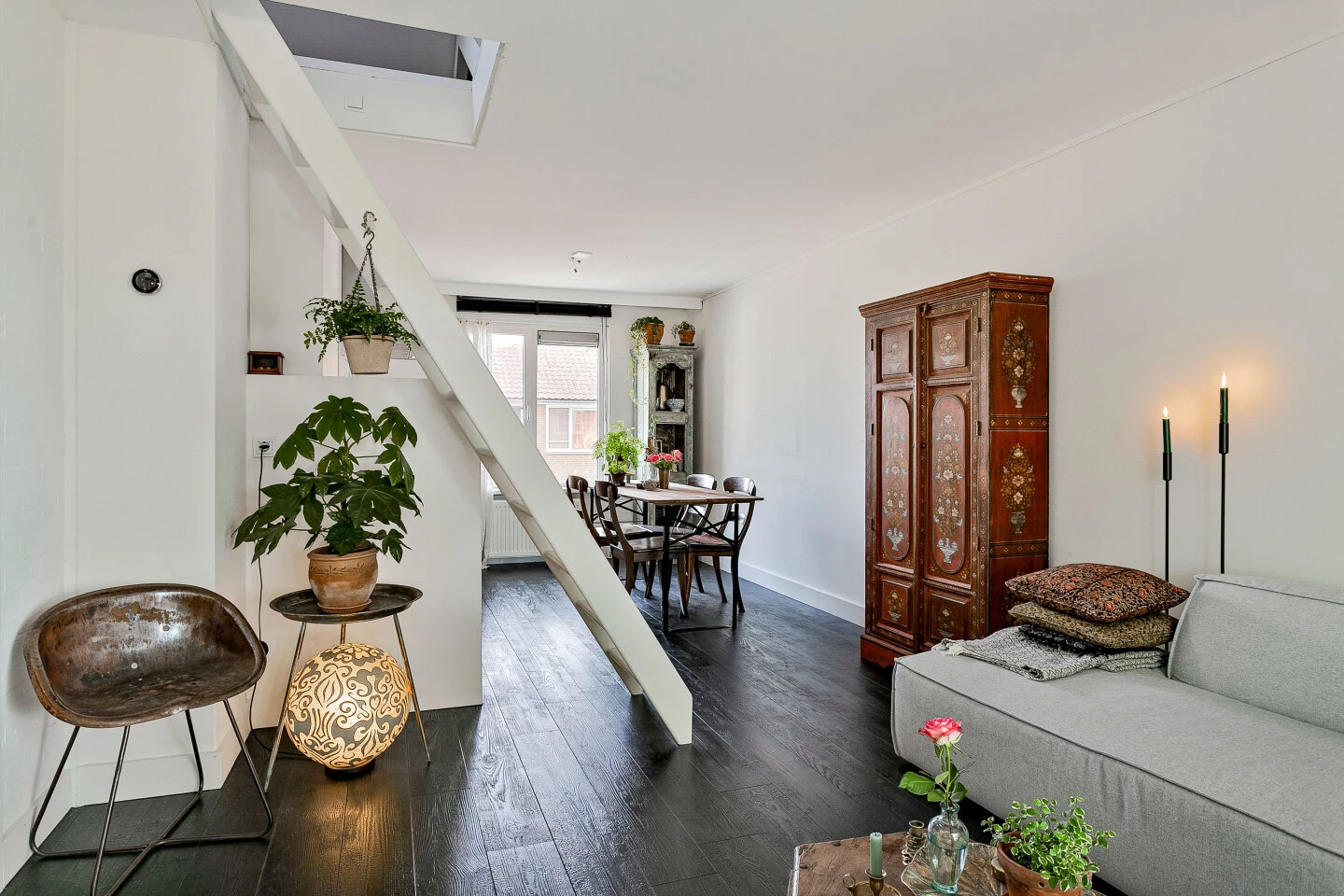 De woonkamer is gelegen aan de voorzijde. Tussen de woonkamer en de keuken is een open trap met toegang naar de speelse kamer op de zolderverdieping die tevens als slaapkamer of als atelier gebruikt kan worden. Hier is verrassend veel bergruimte.