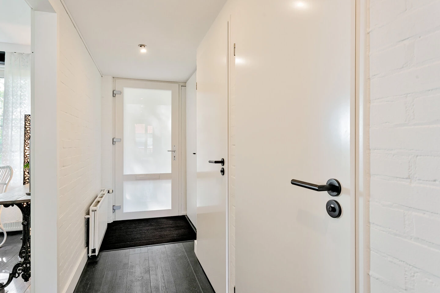 Via de hal kom je in het appartement, hier is een wasruimte met wasmachine aansluiting en de opstelplaats van de cv ketel. op de gang is het toilet, volledig betegeld en separaat van de badkamer.