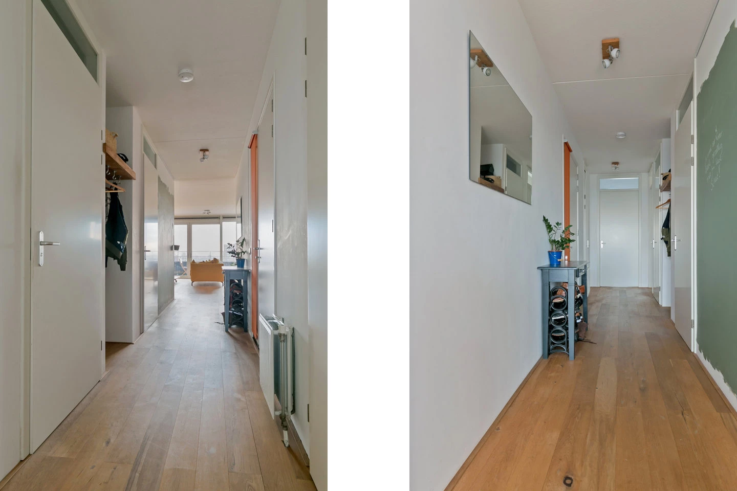 Entree, hal met toilet, bergkast met cv-ketel. Aan de achterzijde zijn twee slaapkamers gelegen met een (tweede)balkon. De badkamer is voorzien van een wastafel, inloopdouche en de wasmachine aansluiting. De grote woonkamer met dubbele schuifpui geeft toegang tot het balkon op het zuiden. Er is een nette open keuken met inbouwapparatuur.