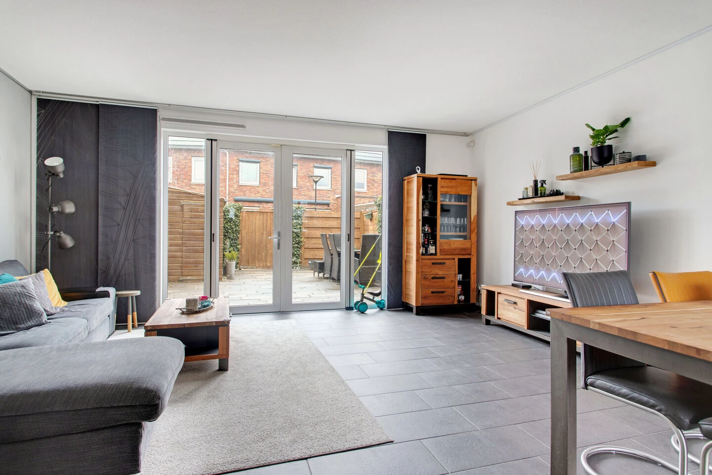 De woonkamer kijkt door de opslaande deur uit over de achtertuin. Door de grote raampartijen komt veel daglicht.