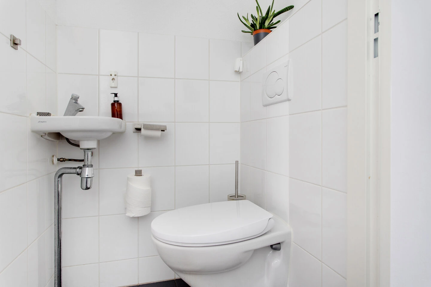 De badkamer heeft een goed formaat en beschikt over alle gemakken. De vloer en wanden zijn voorzien van lichte tegels. Er is een toilet, inloopdouche met douchepaneel en handdouche, wastafelmeubel met dubbele wastafel en designradiator.