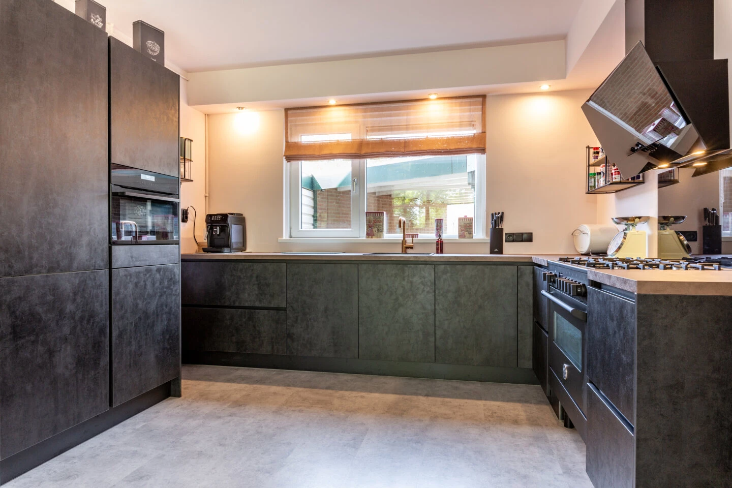 Via de entree kom je in de hal met de meterkast, zwevend toilet met fonteintje, de trapopgang naar de eerste verdieping en deur naar de woonkamer. De ruime, op het zuiden gerichte woonkamer is door de grote raampartijen voorzien van veel daglicht waardoor er een fijn leefklimaat ontstaat. De open hoekkeuken in zwarte betonlook kleurstelling voorzien van diverse inbouwapparatuur waaronder: een combimagnetron, 6 pits gaskookplaat met grote oven, afzuigkap, vaatwasser en grote koelkast. De gehele verdieping is voorzien van stucwerk en een mooie laminaat vloer. Via de deur in de woonkamer kom je in de zeer ruime tuin met diverse terrassen waar je tot de late uurtjes van de ondergaande zon kan genieten.