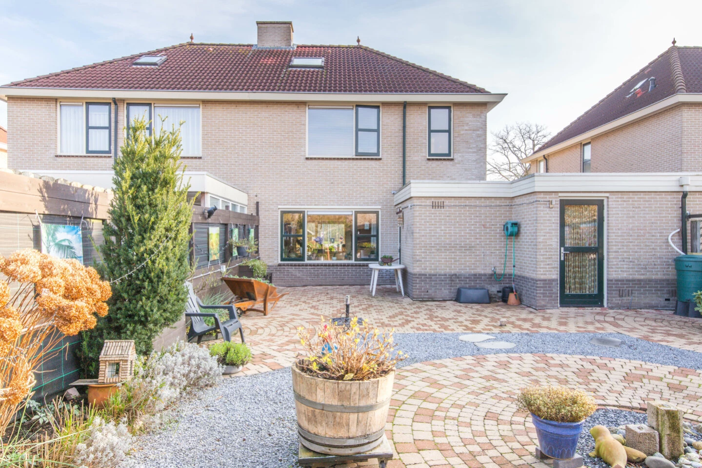 De onderhoudsarme achtertuin is heerlijk voor de kinderen om hier in te vertoeven, ook is er achter in de tuin ruimte om een heerlijke loungeset te plaatsen en er is een vrijstaande houten berging aanwezig.
