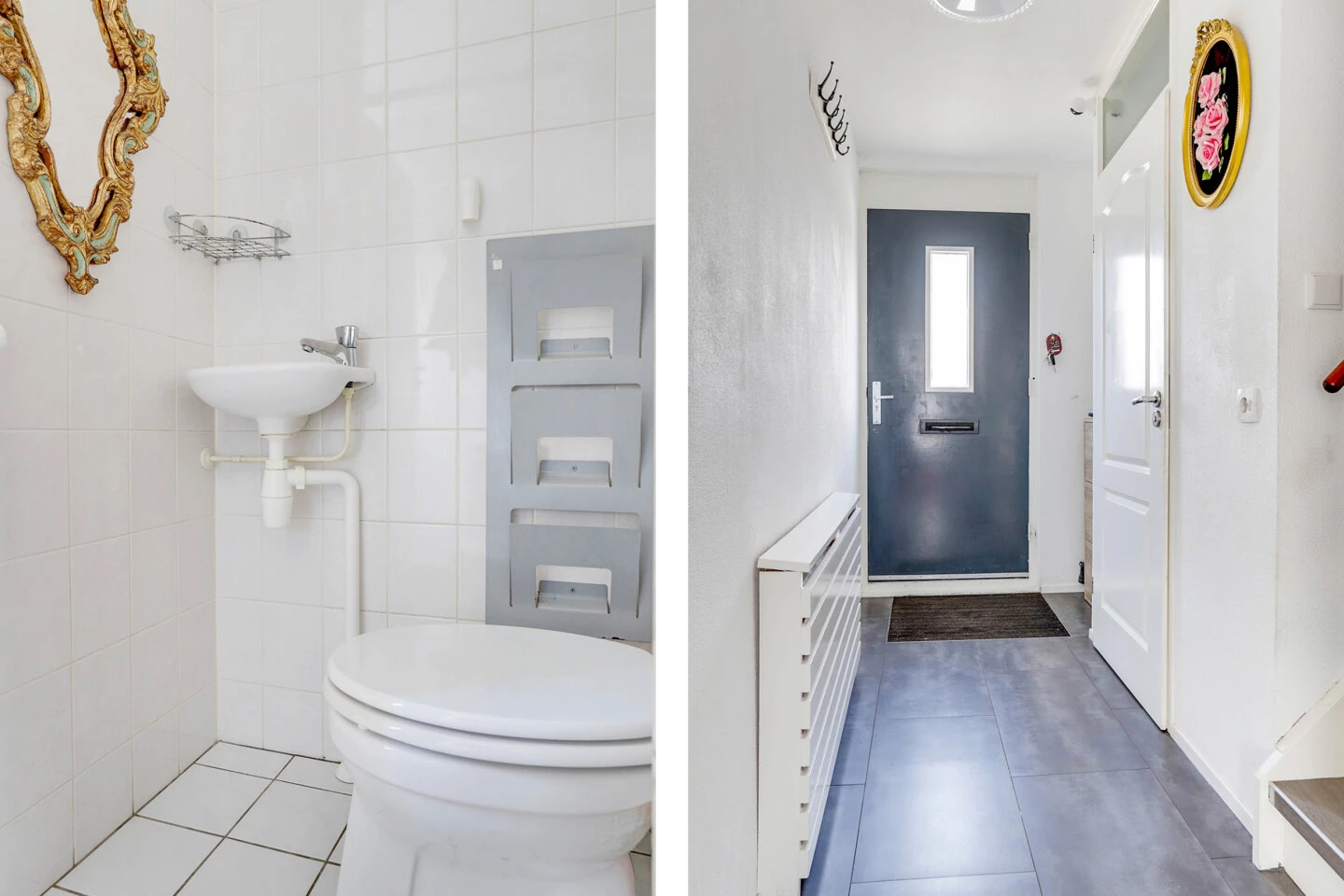 Je betreedt de woning via de entree met toegang tot de geheel betegelde toiletruimte met fonteintje, meterkast, trapopgang, en woonkamer. De gehele begane grond is voorzien van een pvc vloer en de wanden hebben een lichte kleur.