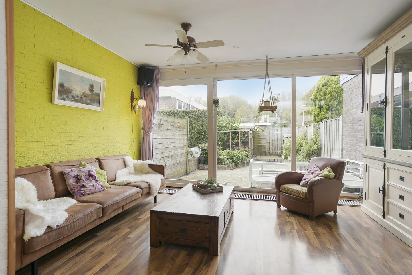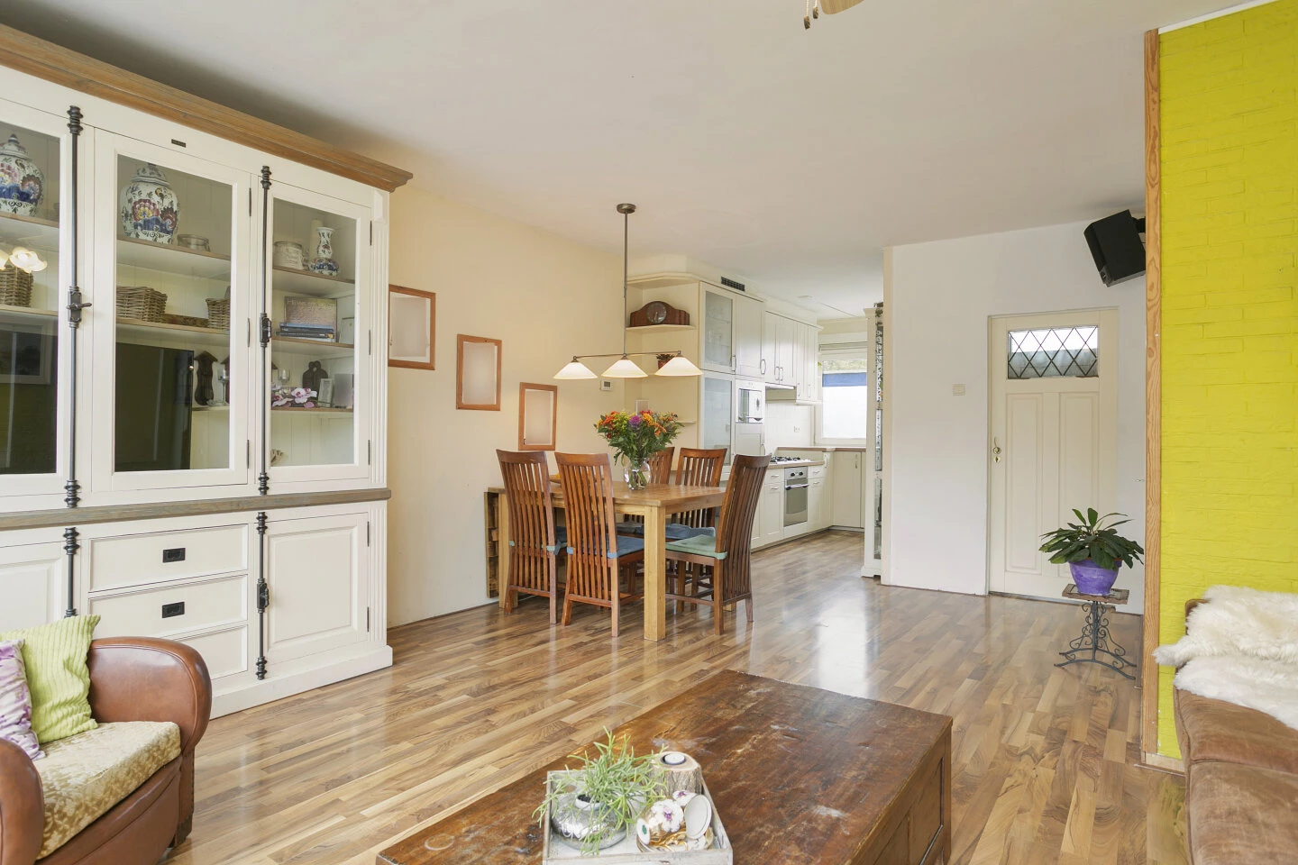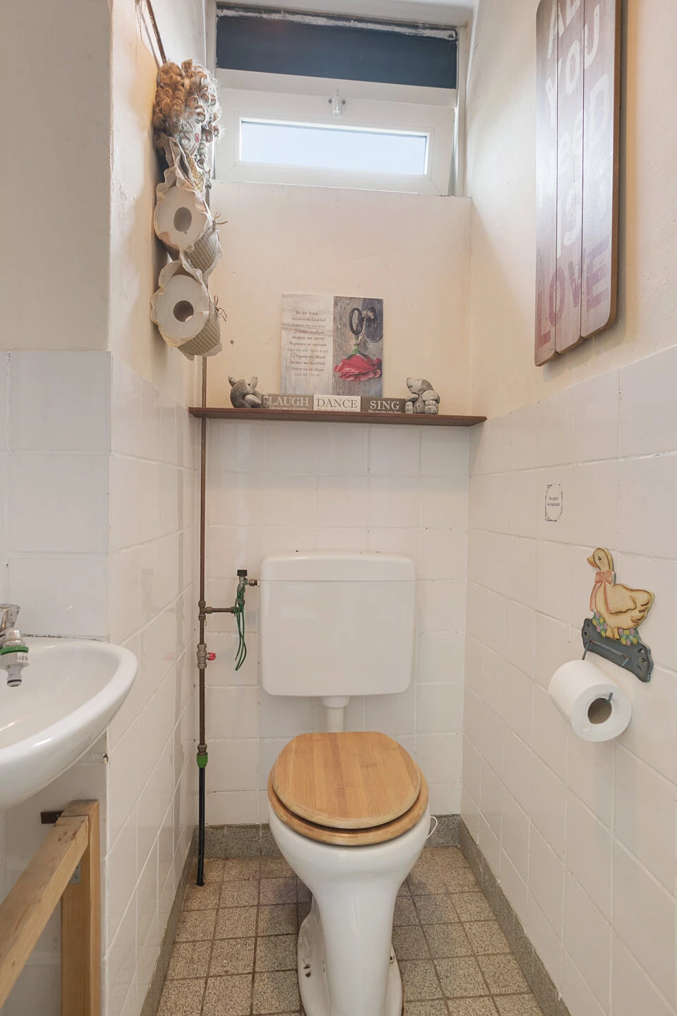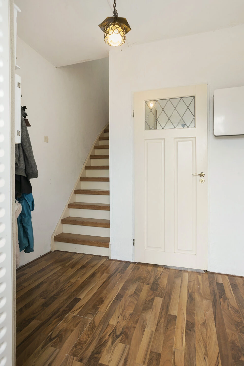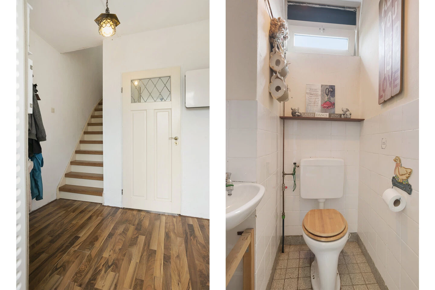 entree, hal met meterkast, toilet voorzien van een fonteintje en de deur naar een ruime woonkamer met een schuifpui naar de diepe achtertuin. De woonkamer is heel licht door de grote raampartij en je hebt zicht op de gezellige tuin. Je kunt via de schuifpui naar de tuin toe. De gehele begane grond is voorzien van een laminaat vloer.