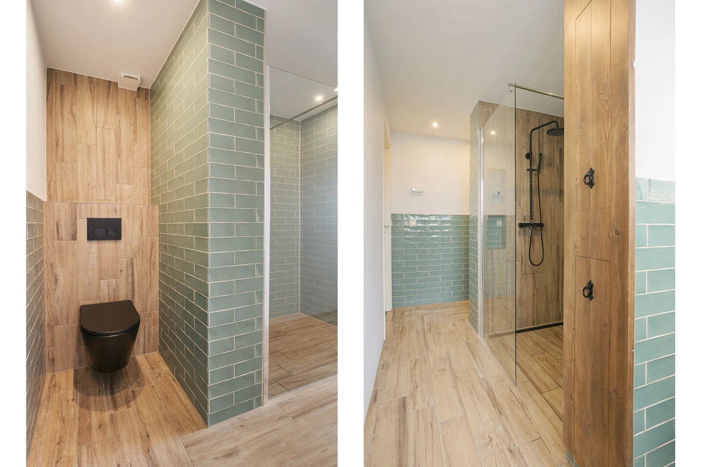 De badkamer is chique, enorm ruim en heerlijk om hier te vertoeven. Deze is betegeld met groene en houtlook tegels. De inloopdouche met glazenwand, zwevend toilet, dubbele wastafel met ladenmeubel en vloerverwarming maken de ruimte vervolgens compleet. Praktisch is het raam dat voor extra daglicht en ventilatie zorgt.