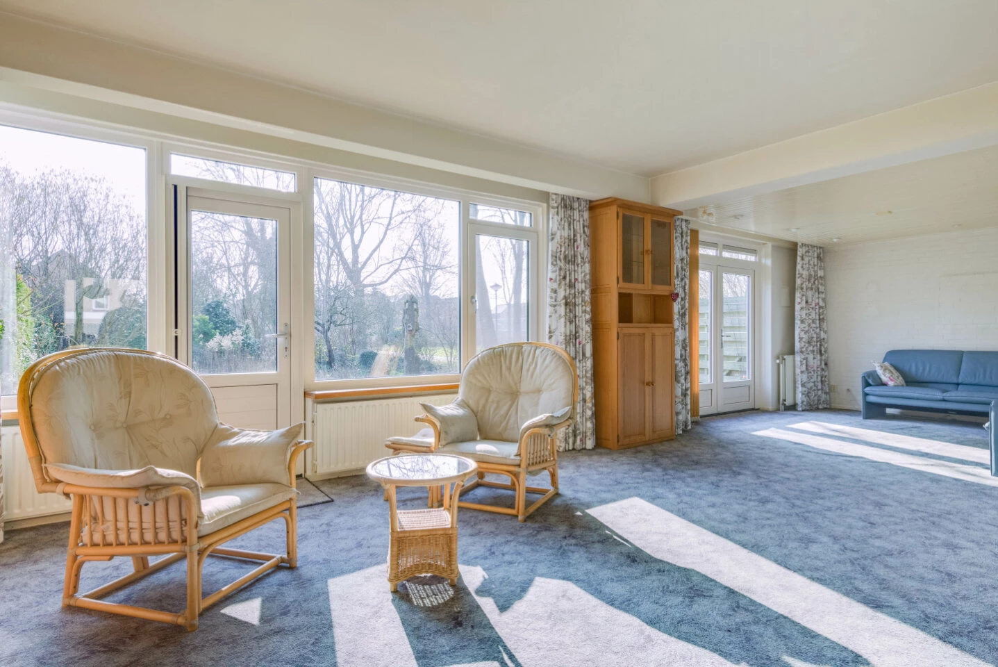 De zeer ruime woonkamer met uitbouw heeft openslaande deuren naar de tuin en vanwege zijn breedte kunnen er meerdere zitgedeeltes worden gecreëerd.
