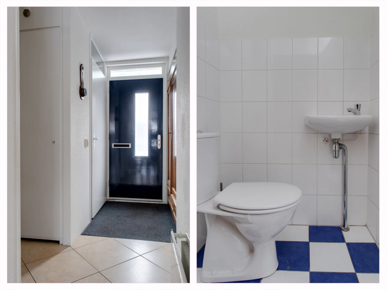 Je betreedt de woning via de entree met toegang tot de betegelde toiletruimte met fonteintje, meterkast, trapopgang en woonkamer. De gehele begane grond is voorzien van vloerverwarming en plavuizen tegels. De wanden zijn gestukt.