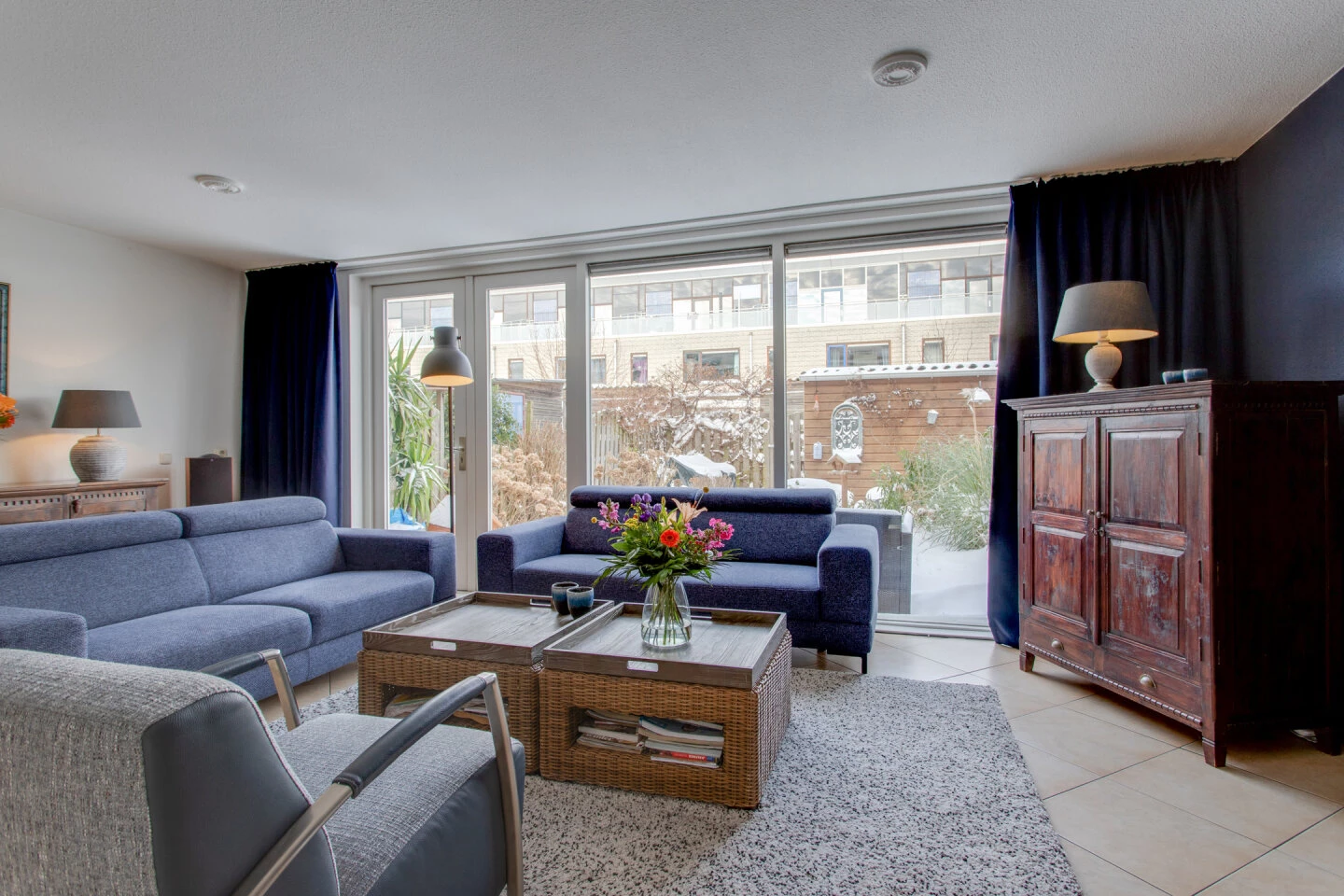 De woonkamer is een sfeervolle leefruimte met heel veel licht door de grote raampartij en zicht de gezellige tuin. De tuin is te betreden via de openslaande deuren.