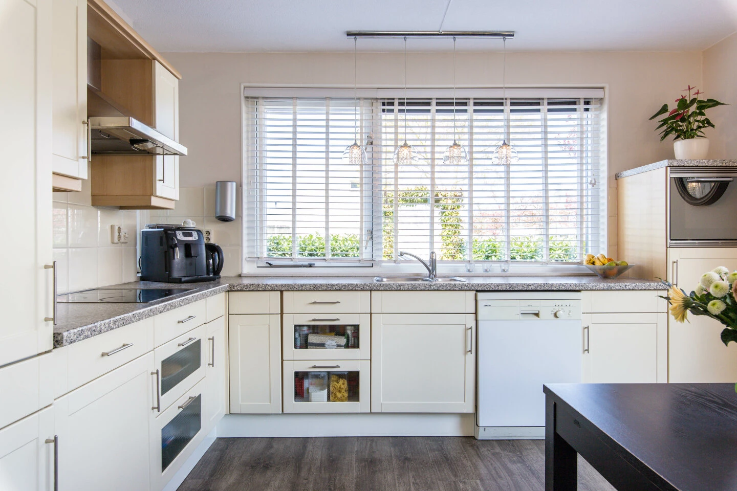 De open keuken is aan de voorzijde gesitueerd en uitgevoerd in een praktische L-hoekopstelling met veel werkruimte. Het is een ruime keuken met voldoende plaats voor een grote eettafel en voorzien van veel natuurlijk licht door de grote raampartijen. De keuken heeft diverse inbouwapparatuur te weten: koel/vriescombinatie, (combi)oven, elektrische kookplaat en een afzuigkap.