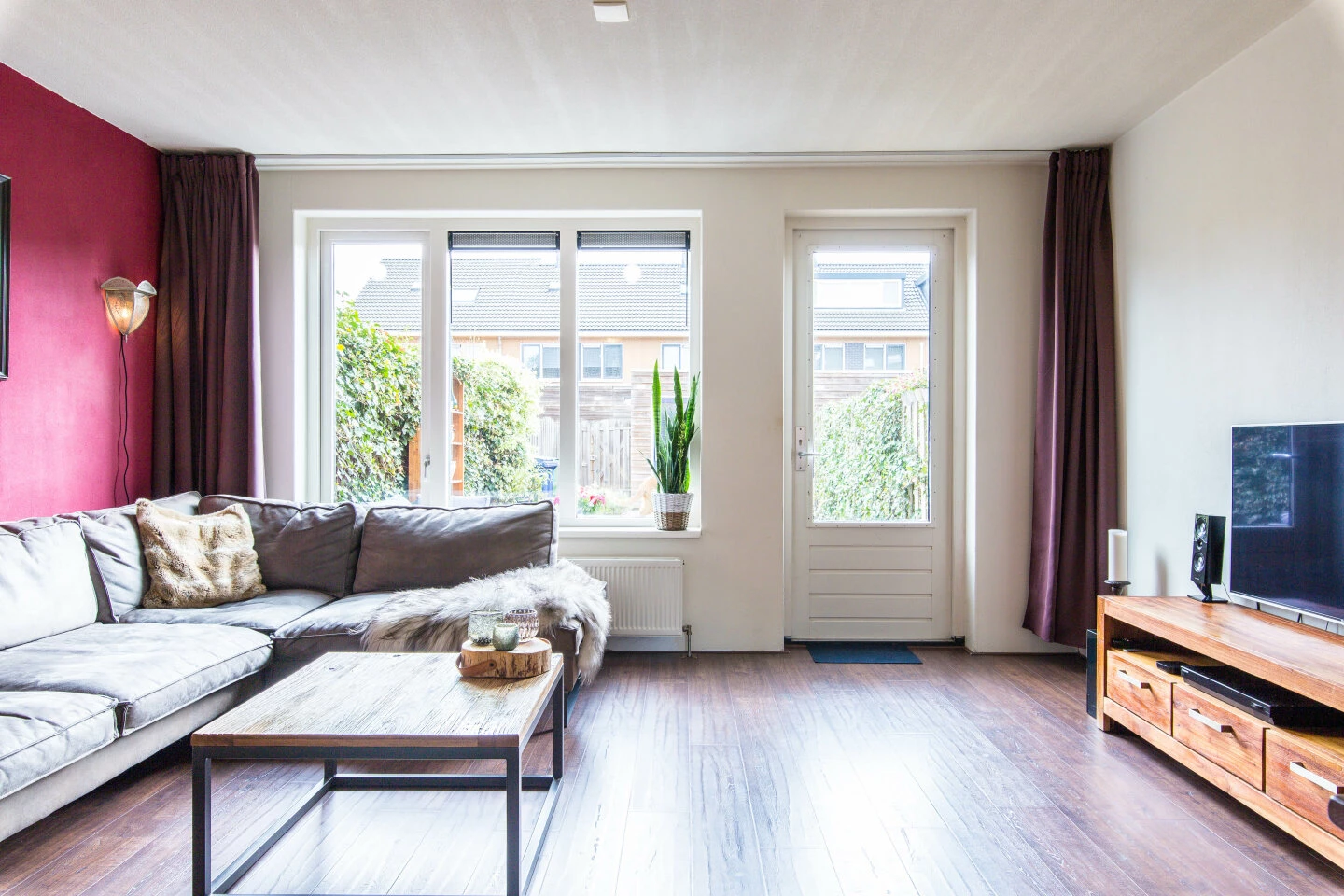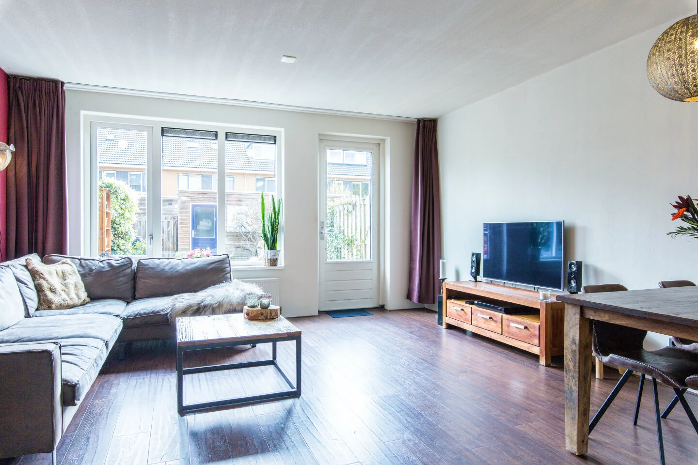 De woonkamer is sfeervol ingericht met heel veel licht door de grote raampartij en zicht op de gezellige tuin welke bereikbaar is door middel van de openslaande tuindeuren.