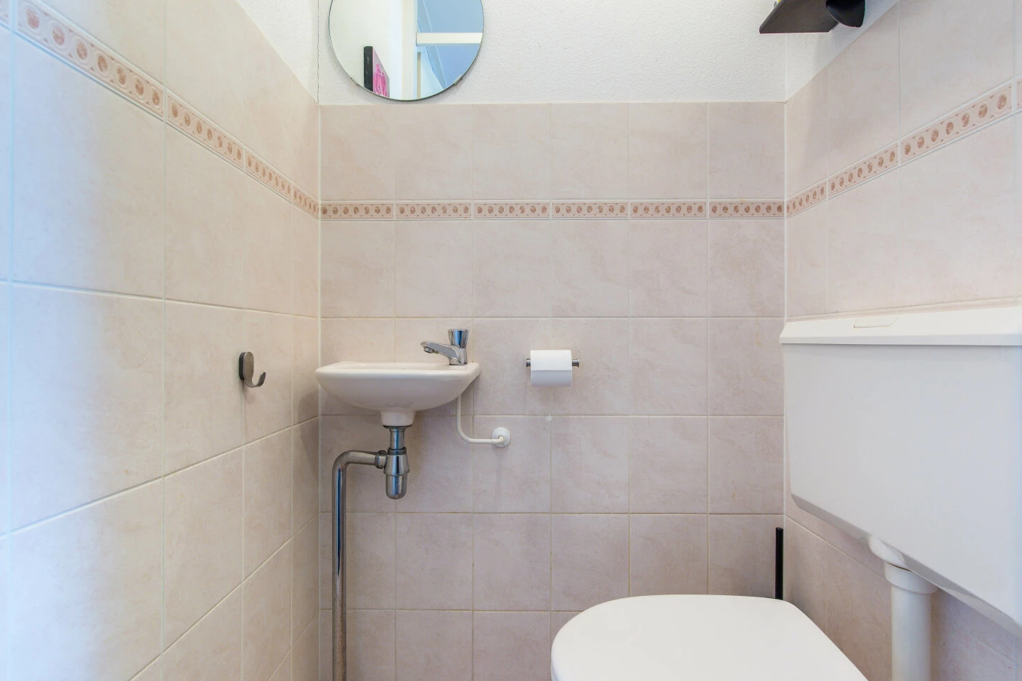 De badkamer is verzorgd en compleet. De vloer en wanden zijn voorzien van lichte tegels. De douchecabine, toilet, kastruimte en wastafel maken de ruimte vervolgens compleet. Praktisch is het raam dat voor extra daglicht en ventilatie zorgt. De gehele verdieping is voorzien van een laminaatvloer.