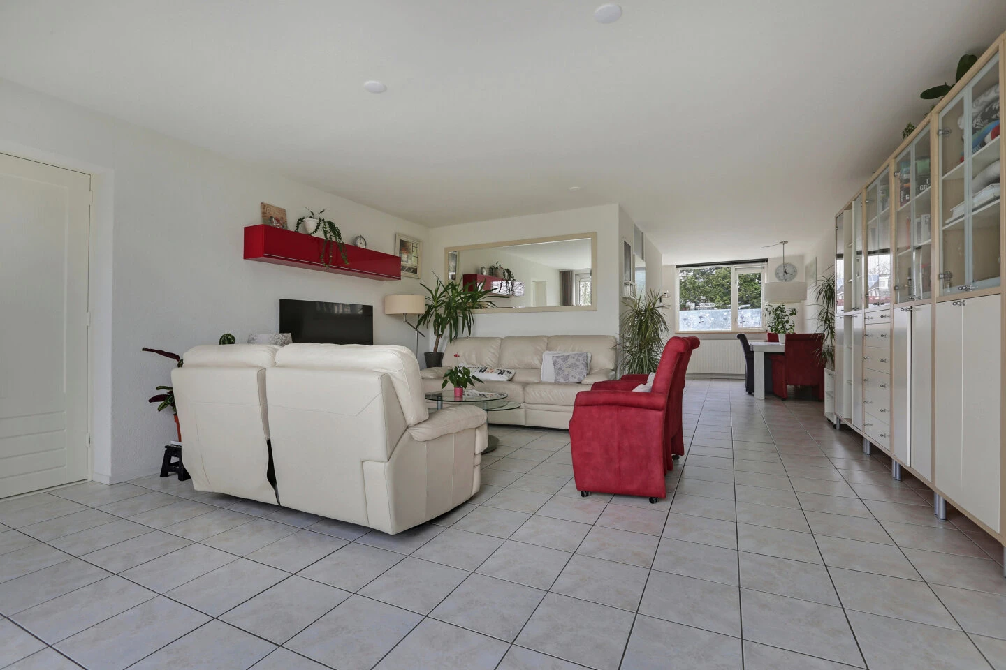 De uitgebouwde doorzonwoonkamer is tuingericht en heel licht door de grote dubbele schuifpui.