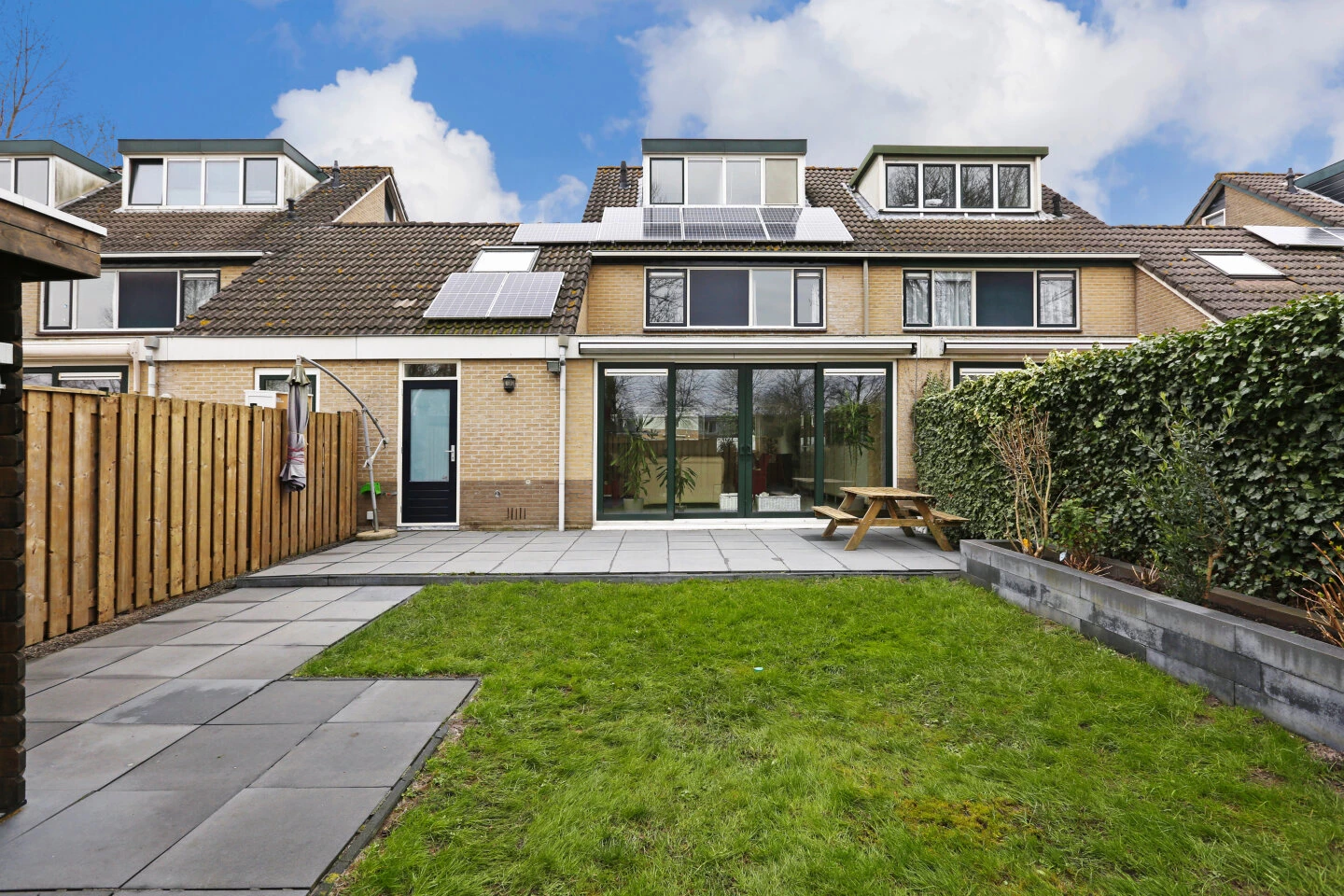 Vanuit de woonkamer stap je via de dubbele schuifpui in de zonnige achtertuin op het zuidoosten. De tuin is afgewisseld met bestrating, gras en borders. De achtertuin biedt veel privacy, de schutting is aan de achterzijde voorzien van een poort. Achter in de tuin is een houten berging. Aan de voorzijde van de woning is er een betegelde tuin. De aangebouwde garage is aan de voorzijde en voorzien van elektra. Hier tref je de wasmachine aansluiting en biedt veel ruimte voor bijvoorbeeld fietsen.