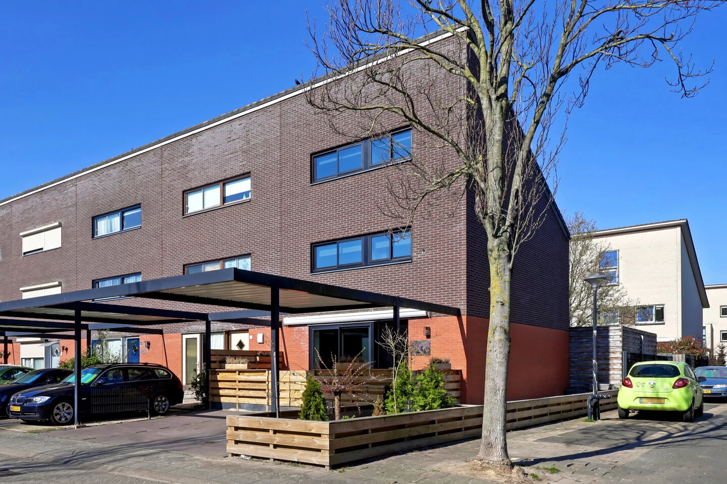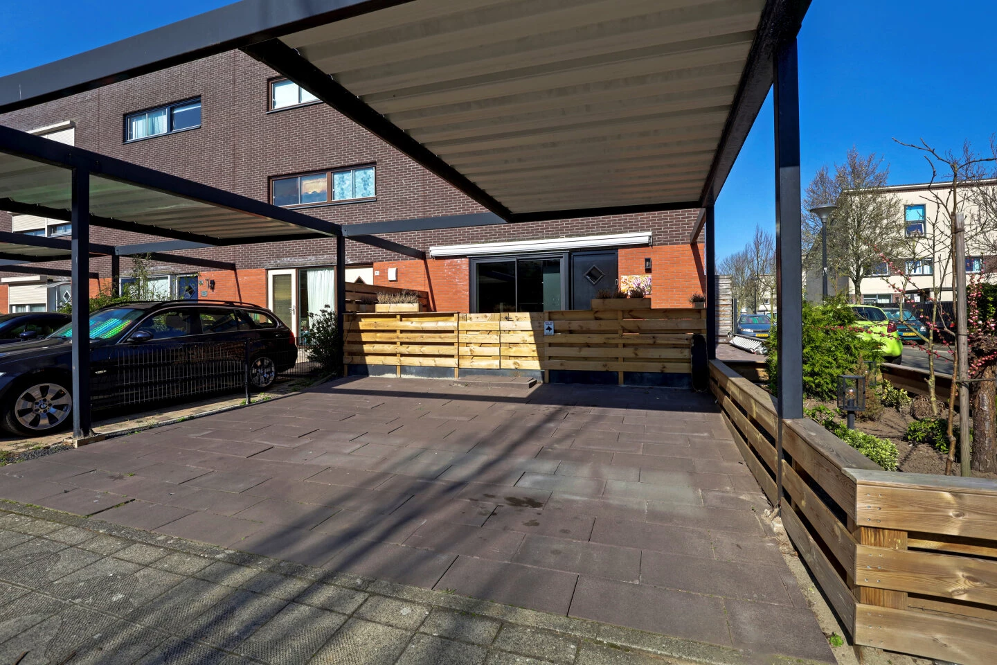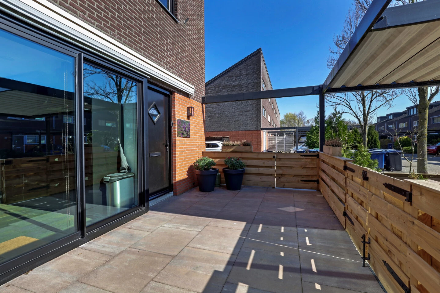 De voortuin is in 2021 opnieuw aangelegd en opgehoogd, hier is een parkeerplaats voor 2 auto's op eigen terrein. Ook vanuit de keuken is de voortuin via de aluminium schuifpui te bereiken, Je zit hier heerlijk op het afgeschermd terras met zonnescherm.