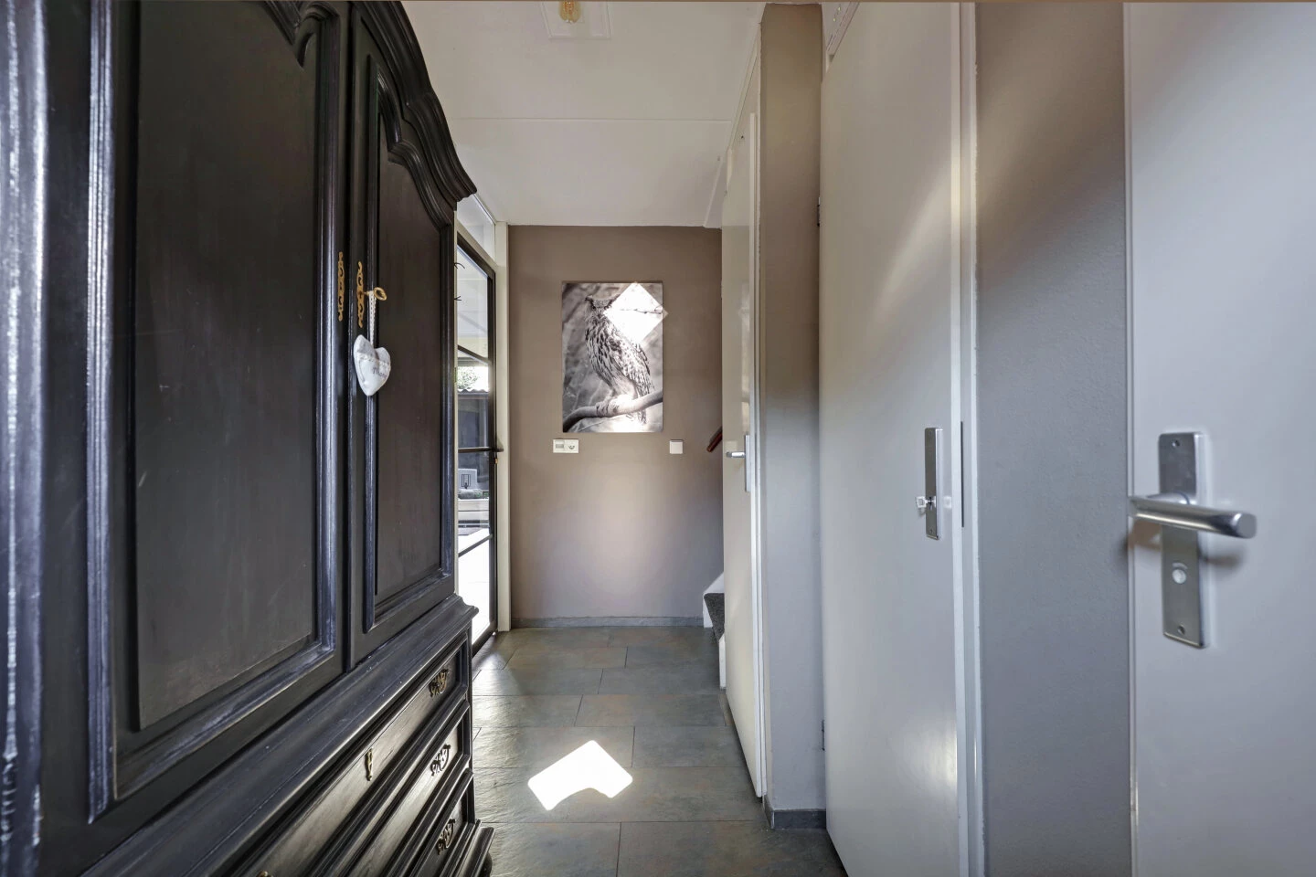 Je komt binnen via de ruime entree met toiletruimte, meterkast en bergkast, verder de trapopgang naar de eerste etage en toegang tot de woonkamer en keuken. De woonkamer is ruim en heel licht door de grote aluminium schuifpui aan de achterzijde. Via de hal kom je bij de trapopgang naar de verdieping. De gehele begane grond is voorzien van een plavuizen vloer in leisteen-look met vloerverwarming.