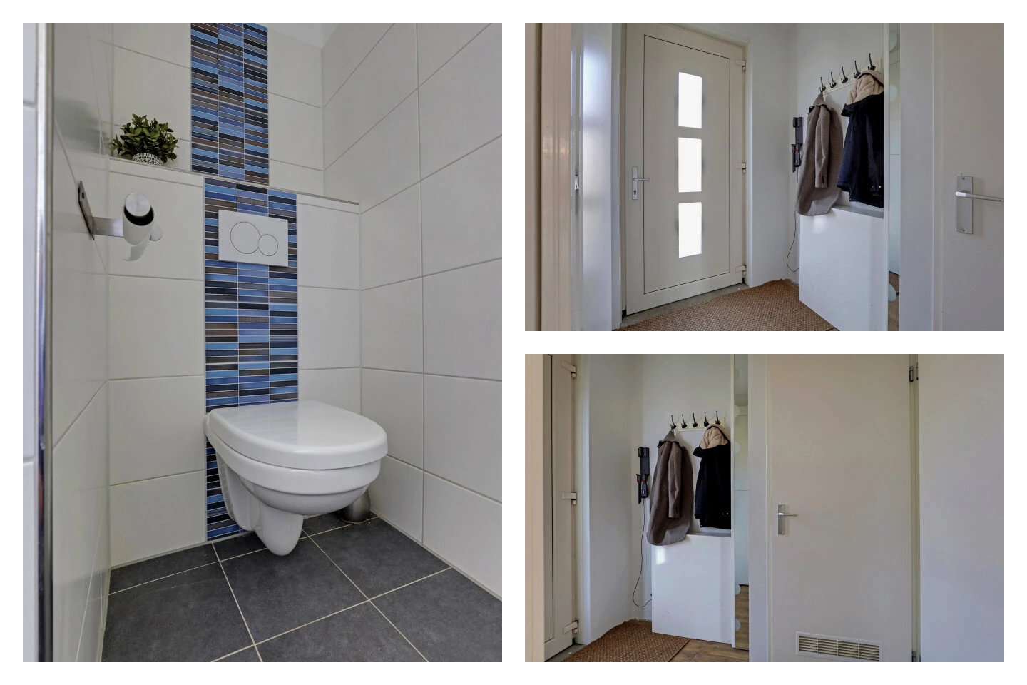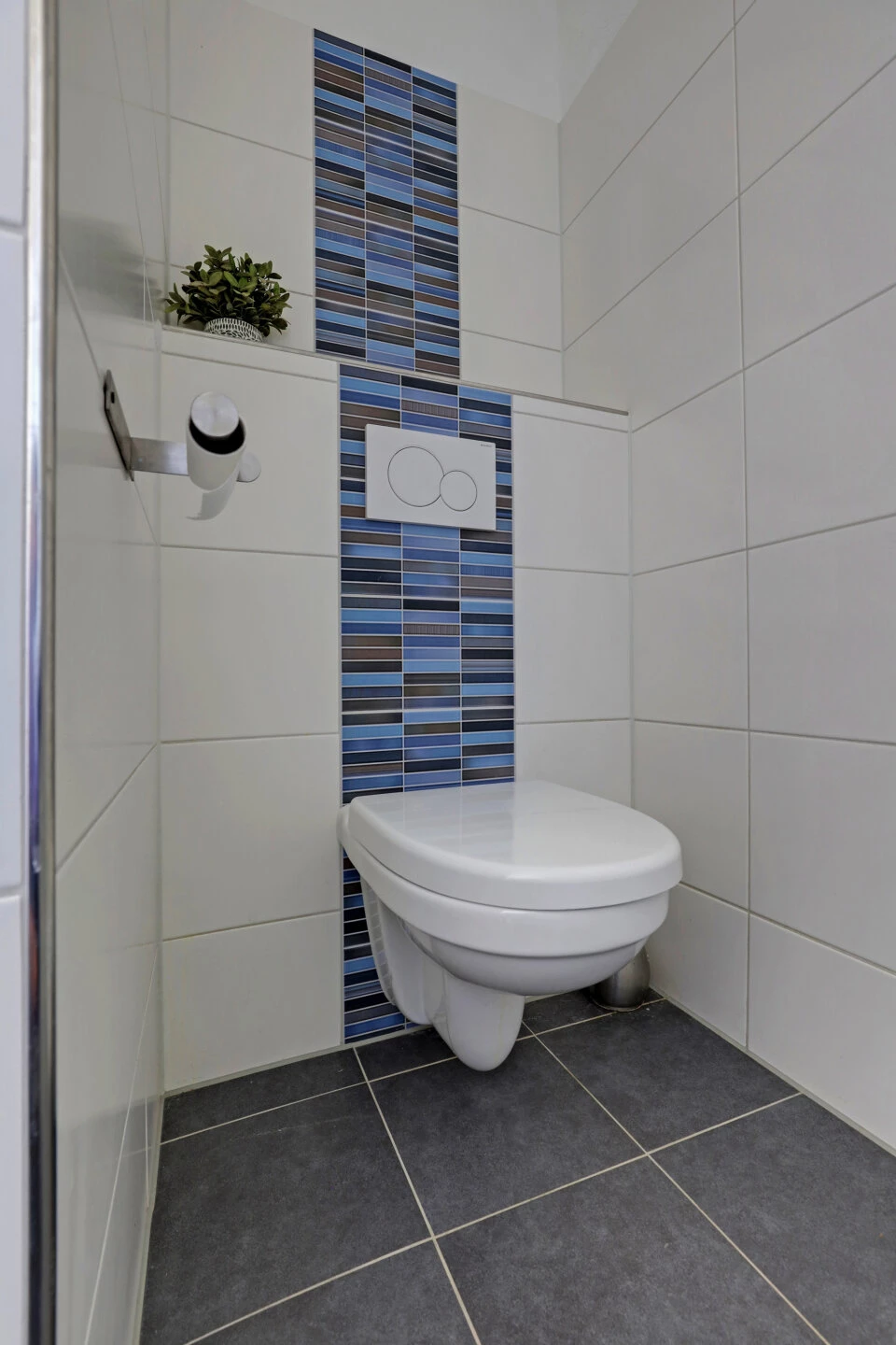 De badkamer is ruim en praktisch ingedeeld. De vloer is voorzien van grijze tegels en de wanden hebben lichte tegels. Het toilet is gescheiden door een muurtje en voorzien van een hangend toilet. Verder tref je een groot wastafelmeubel en een inloopdouche, Er is nog genoeg ruimte om een kast in te plaatsen. Praktisch is het smalle raam dat voor extra daglicht en ventilatie zorgt.