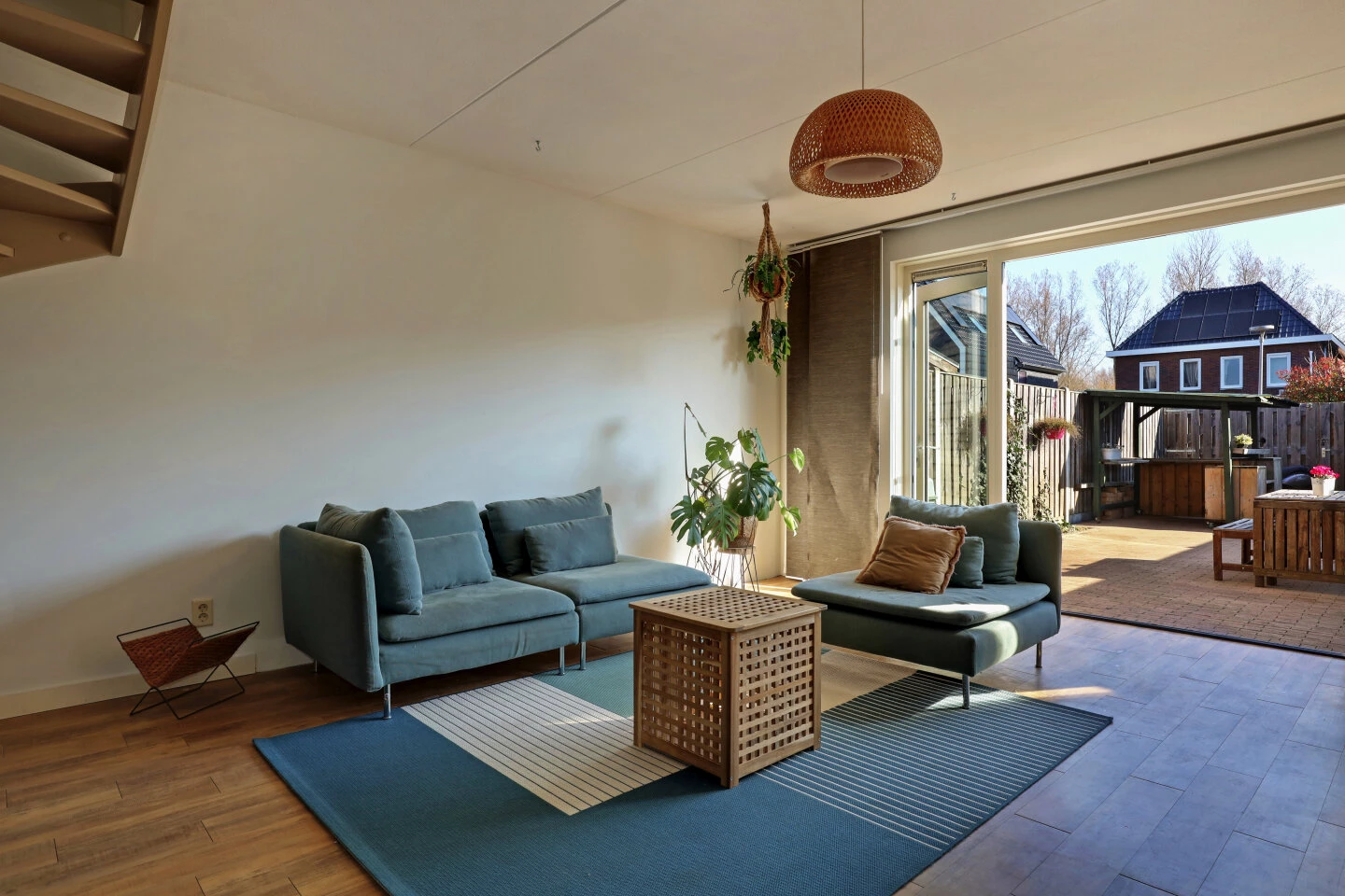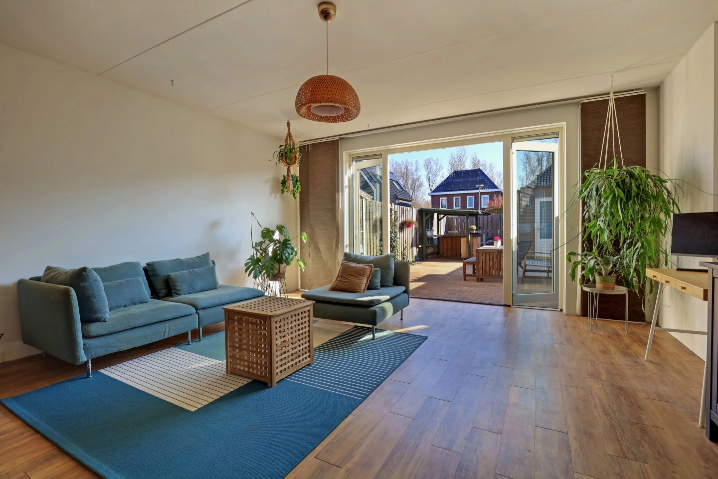 Je betreedt de woning via de entree met toegang tot de deels betegelde toiletruimte, meterkast, trapopgang en woonkamer. De doorzonwoonkamer is een sfeervolle leefruimte met heel veel licht door de grote raampartij en zicht op gezellige tuin welke bereikbaar is door middel van de openslaande deuren. De gehele begane grond is voorzien van een laminaat vloer en vloerverwarming.