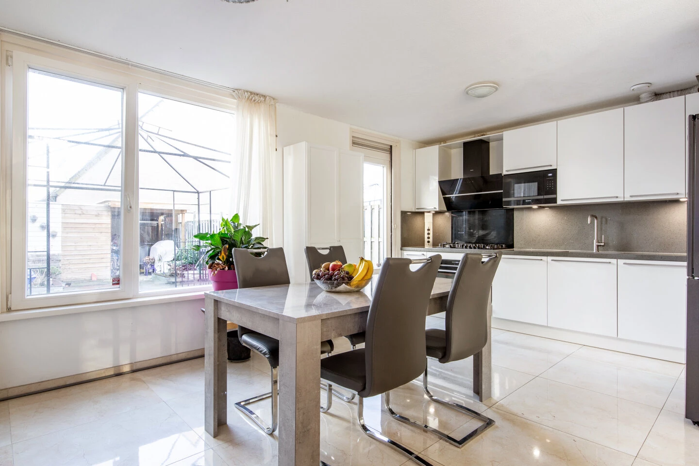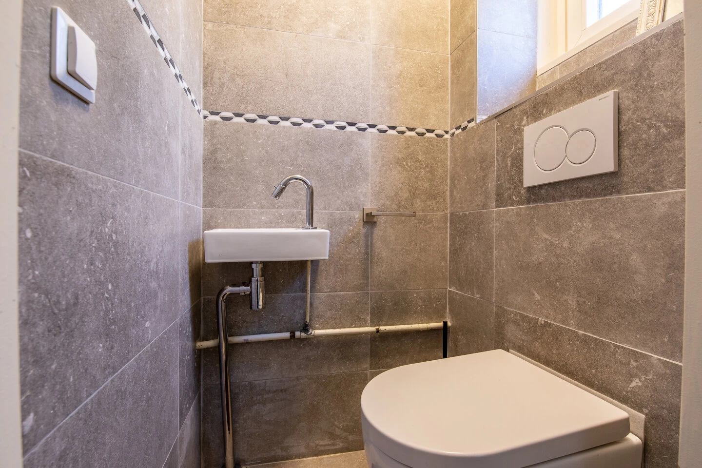Lichte hal met trap, meterkast en volledig betegeld toilet met fonteintje uit 2021. De lichte woonkamer en keuken is voorzien van een mooie plavuizenvloer met lichte kleurstelling, door de grote ramen valt er veel licht in de woning.. De mooie open keuken uit 2021 is voorzien van diverse inbouwapparatuur waaronder: 5 pits gaskookplaat, afzuigkap, combimagnetron, grote oven en vaatwasser.