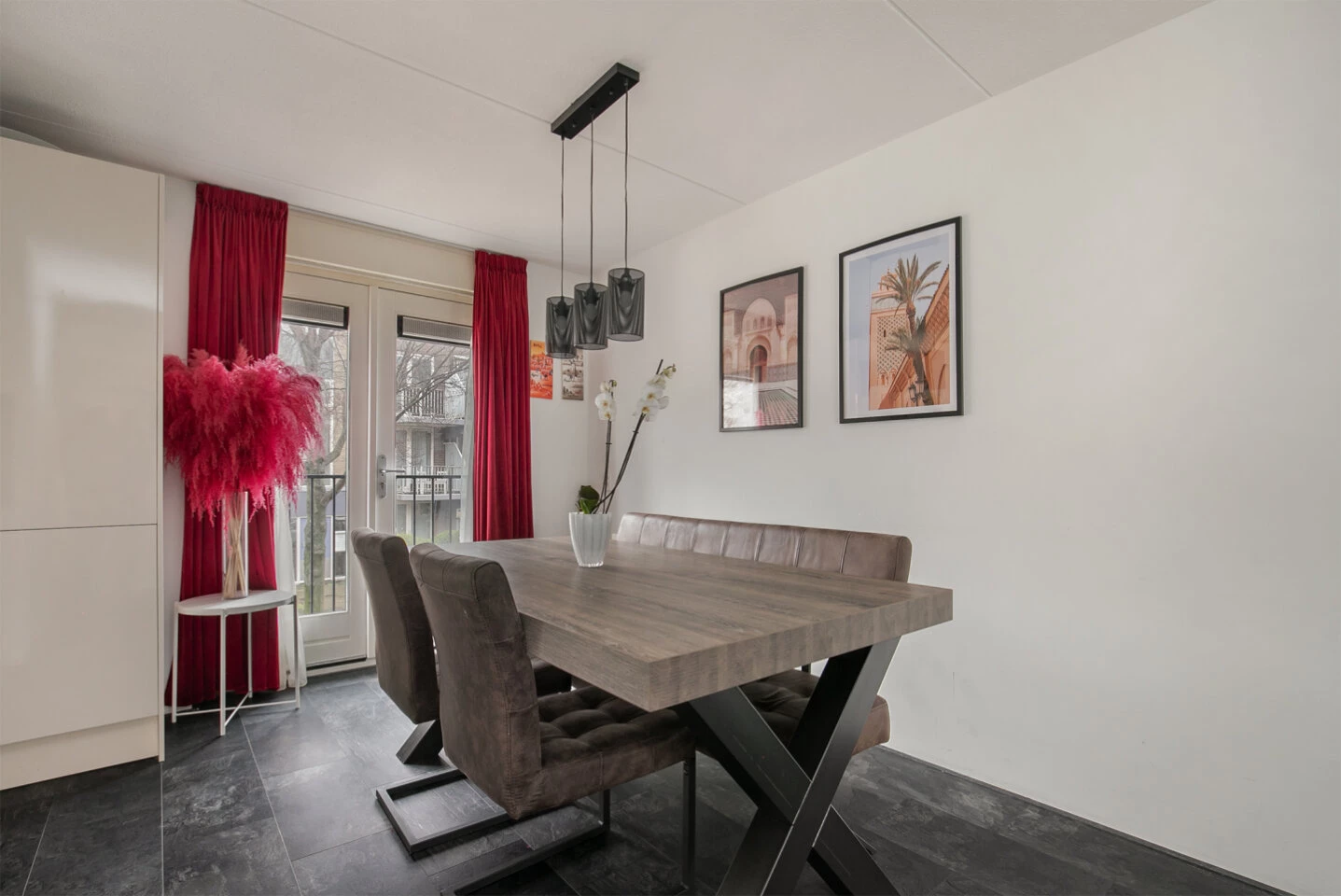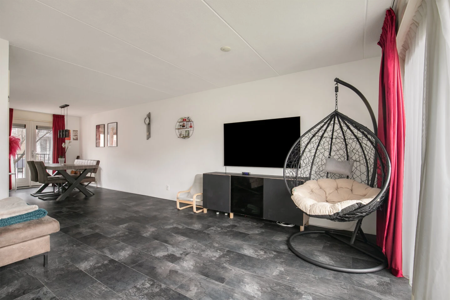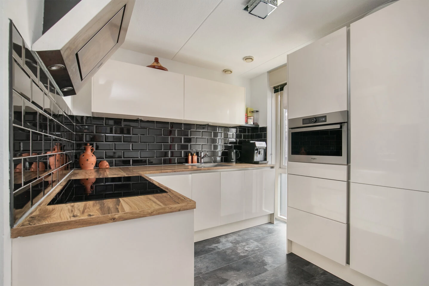 Op de eerste verdieping is de woonkamer gelegen, via de openslaande deuren kom je op het ruime zonneterras uit welke op het zuiden gelegen is en waar je tot de late uurtje kan vertoeven. De moderne keuken uit 2019 in lichte kleurstelling en licht houten werkblad is voorzien van greeploze deurpanelen, inductie kookplaat, afzuigkap, koelkast en vriezer en combi magnetron. De keuken beschikt over veel kastruimte. De gehele verdieping is voorzien van een moderne tegellook laminaatvloer.