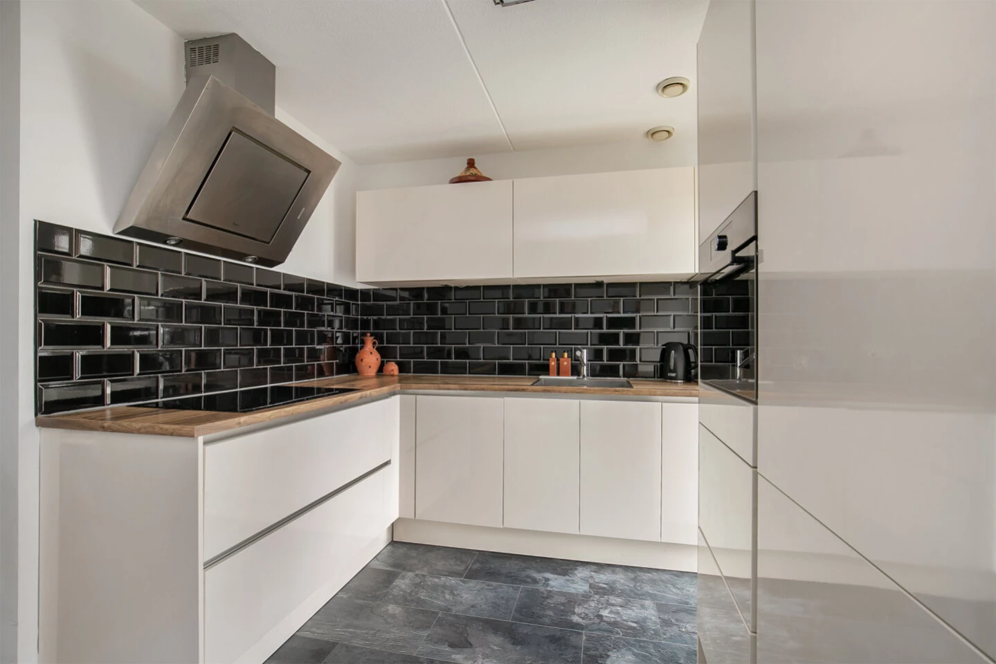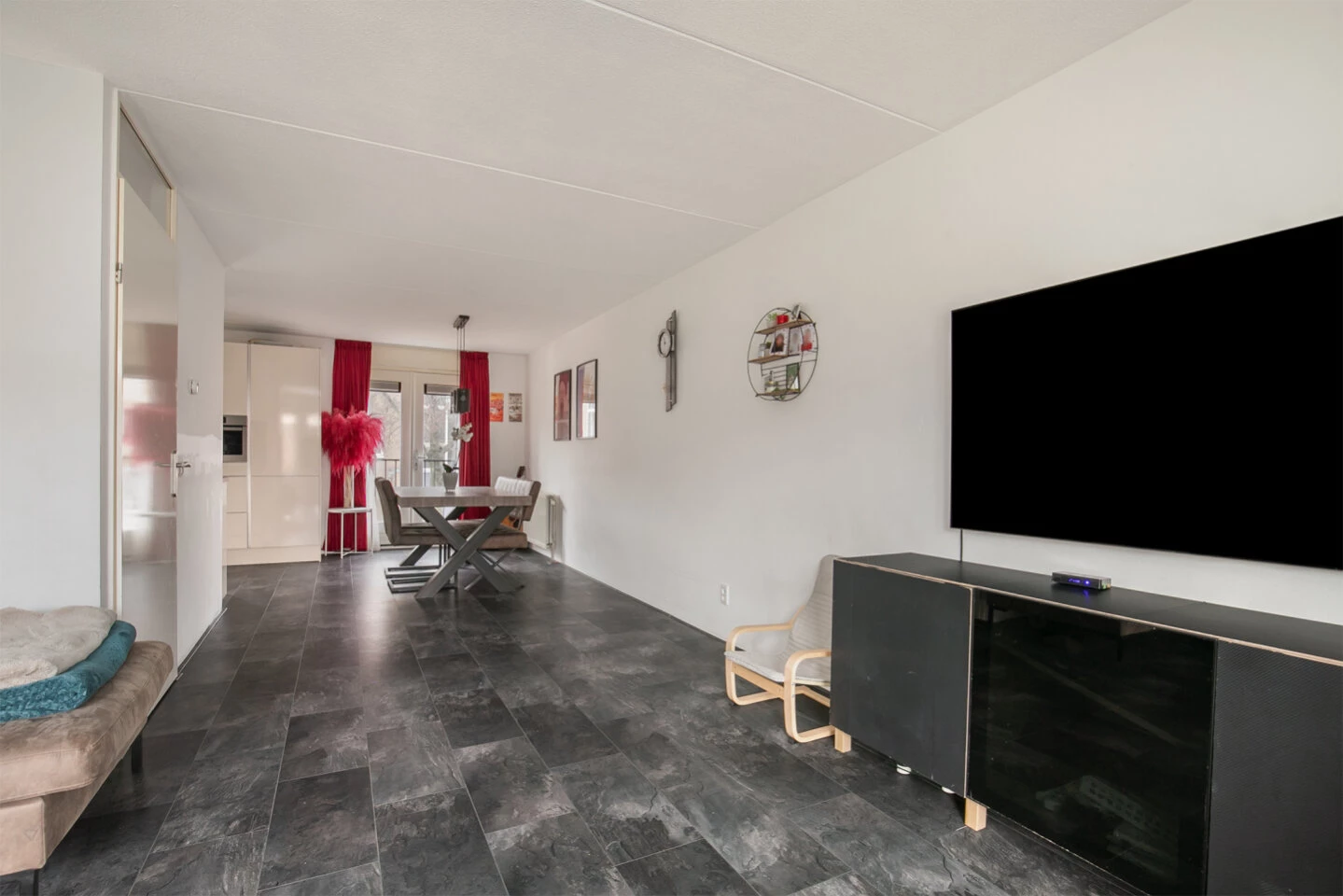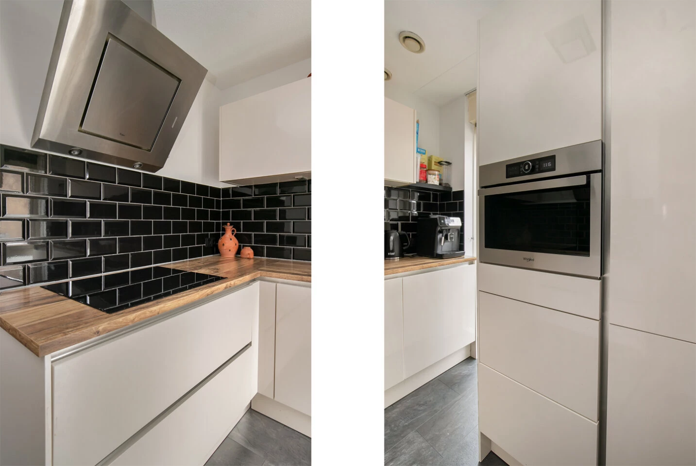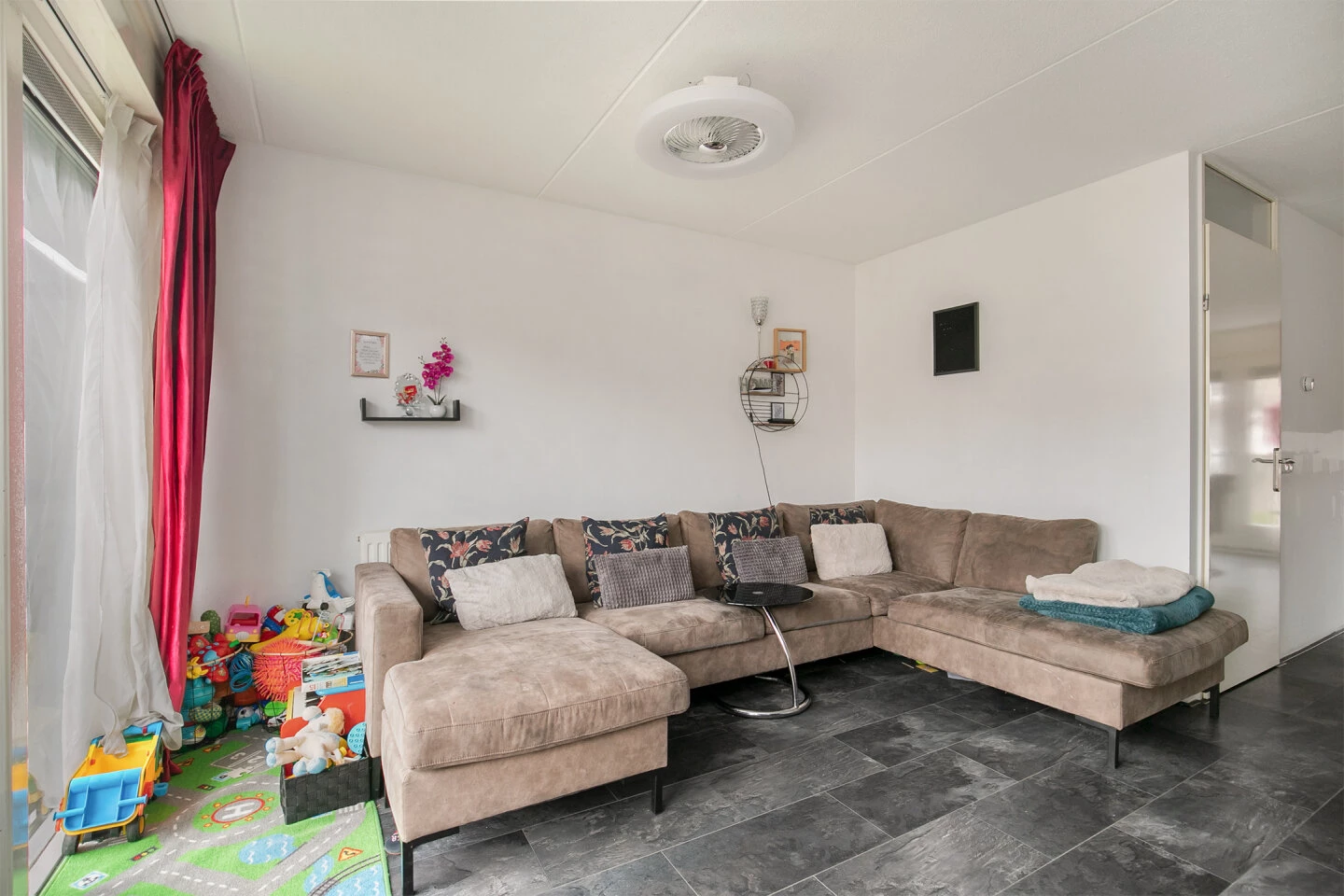 Op de eerste verdieping is de woonkamer gelegen, via de openslaande deuren kom je op het ruime zonneterras uit welke op het zuiden gelegen is en waar je tot de late uurtje kan vertoeven. De moderne keuken uit 2019 in lichte kleurstelling en licht houten werkblad is voorzien van greeploze deurpanelen, inductie kookplaat, afzuigkap, koelkast en vriezer en combi magnetron. De keuken beschikt over veel kastruimte. De gehele verdieping is voorzien van een moderne tegellook laminaatvloer.