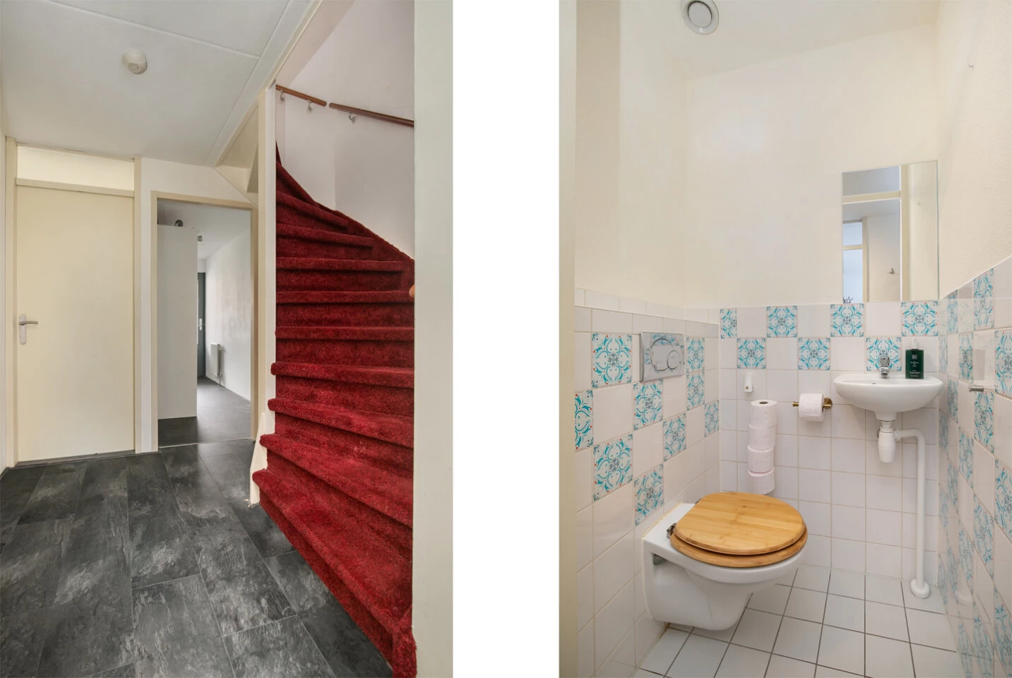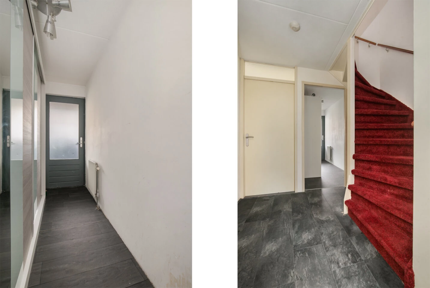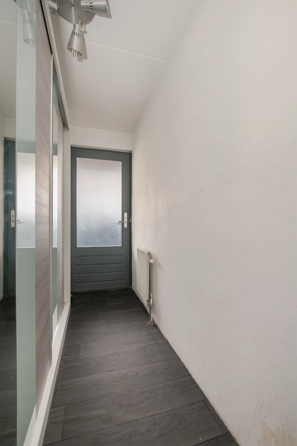 Overdekte entree, hal met meterkast, toilet voorzien van een fonteintje, deur naar de badkamer voorzien van douche, was meubel en designradiator. Twee deuren naar de slaapkamers en een deur naar de berging waar je via de achterkant de woning ook kan verlaten. De verdieping is voorzien van een moderne tegellook laminaatvloer. Via de trap bereik je de eerste verdieping.