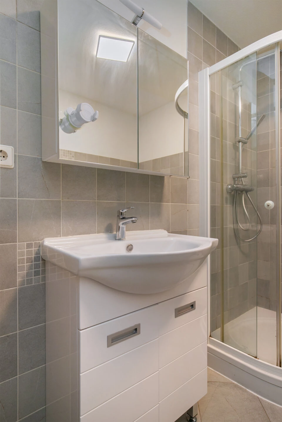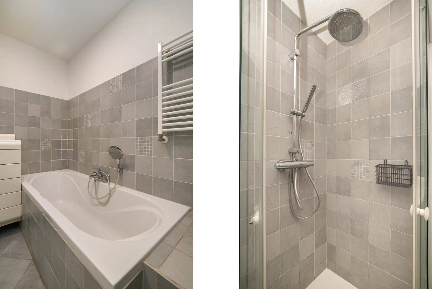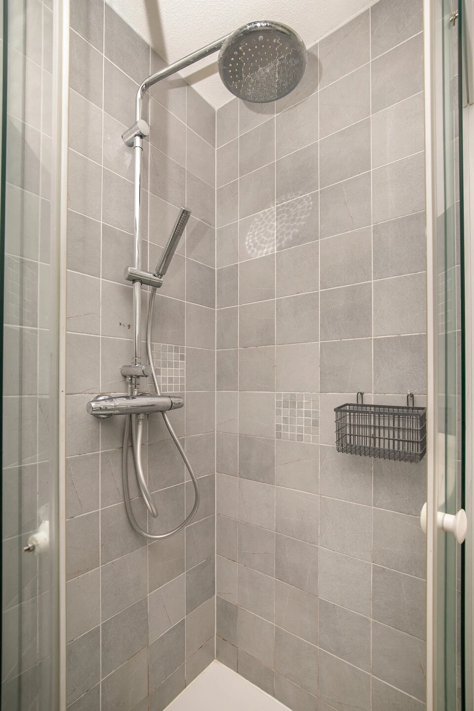 Overdekte entree, hal met meterkast, toilet voorzien van een fonteintje, deur naar de badkamer voorzien van douche, was meubel en designradiator. Twee deuren naar de slaapkamers en een deur naar de berging waar je via de achterkant de woning ook kan verlaten. De verdieping is voorzien van een moderne tegellook laminaatvloer. Via de trap bereik je de eerste verdieping.