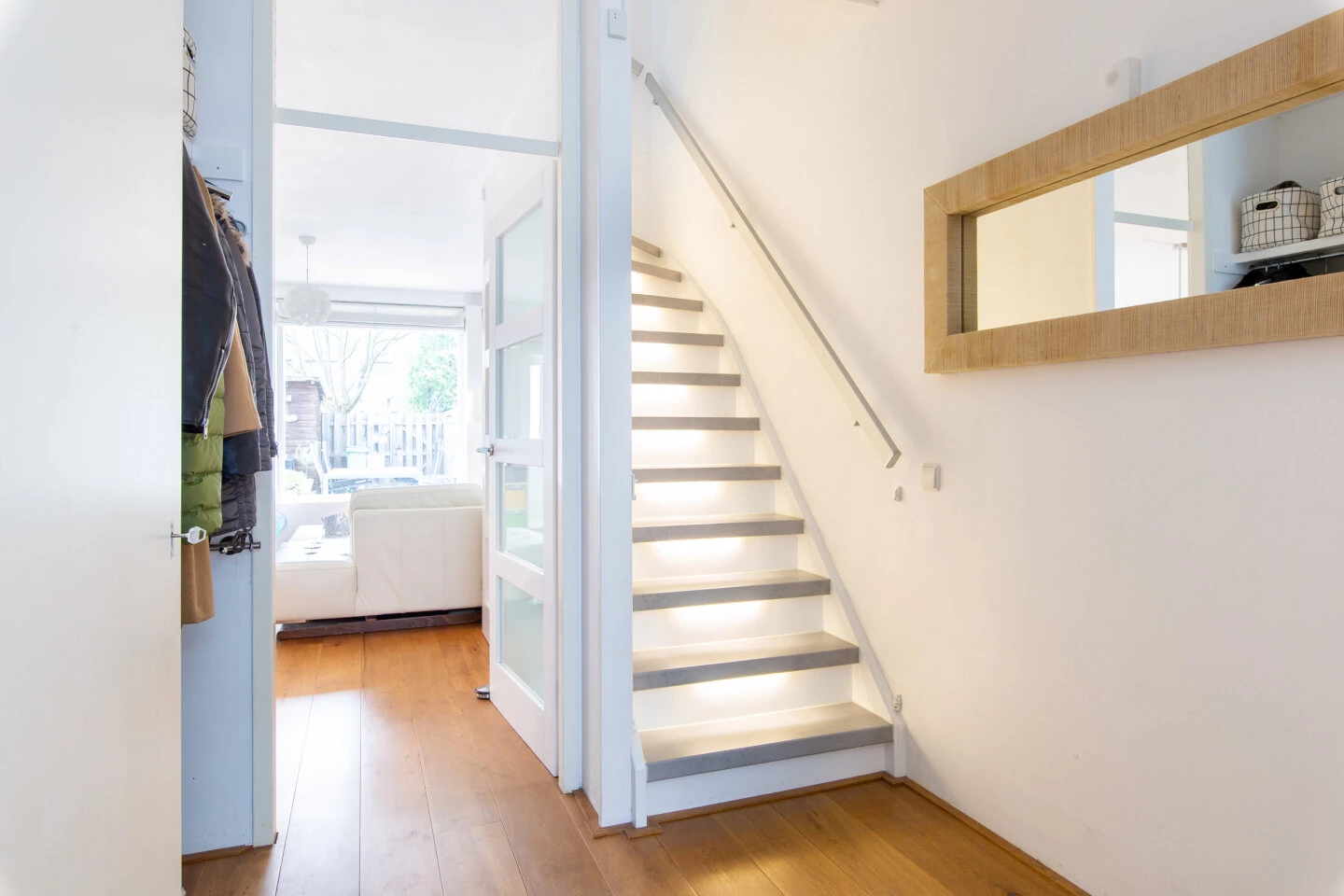 Entree, hal, garderobe, meterkast en toiletruimte met hangend toilet. Een echte eyecatcher is toch wel de gerenoveerde en verlichte trap naar de eerste verdieping. Ruime woonkamer met grote ramen uitkijkend over de achtertuin. De woonkamer beschikt over een trap-/ bergkast en deur naar de zonnig gelegen achtertuin en is voorzien van designradiatoren. Aan de voorzijde van de woning treft u de half open keuken met bar waar u heerlijk aan kunt zitten ontbijten en kranten. De keuken is voorzien van alle gemakken zoals 5-pits gasfornuis, RVS-afzuigkap, oven, vaatwasser koel/vriescombinatie en boiler (2018). De gehele begane grond , met uitzondering van het toilet, voorzien van stukwerk en een eikenhouten vloer.