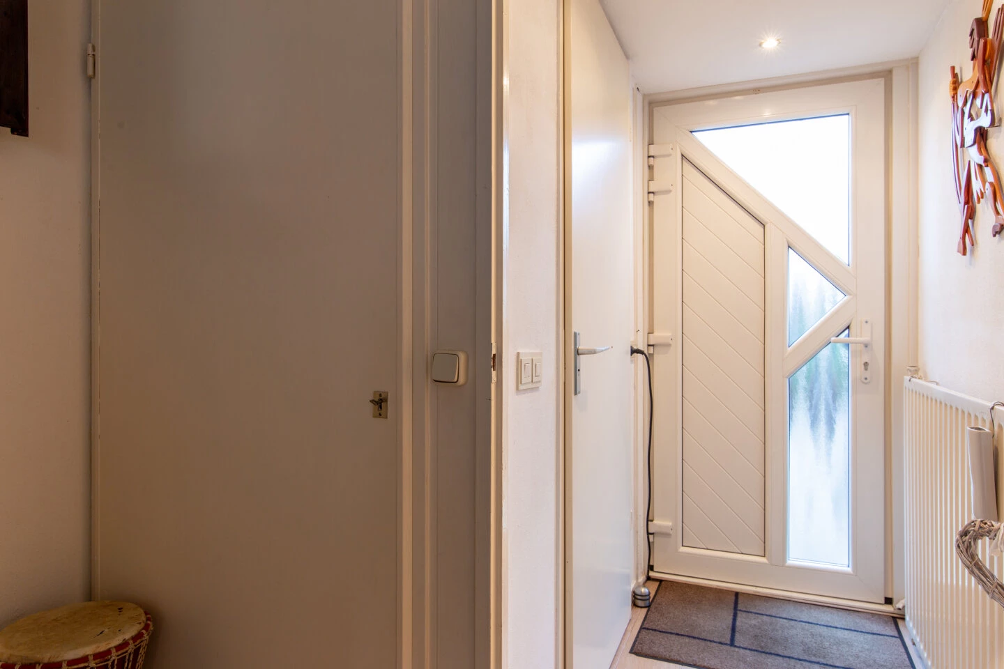 Entree, hal, toilet met fonteintje, bergkast en lichte woonkamer met grote raampartijen met bij de eethoek openslaande deuren naar de tuin met aangebouwde stenen berging en achterom. complete inbouwkeuken in L-opstelling. De keuken is voorzien van een vaatwasser, koelkast, combi oven, gaskookplaat en afzuigschouw.