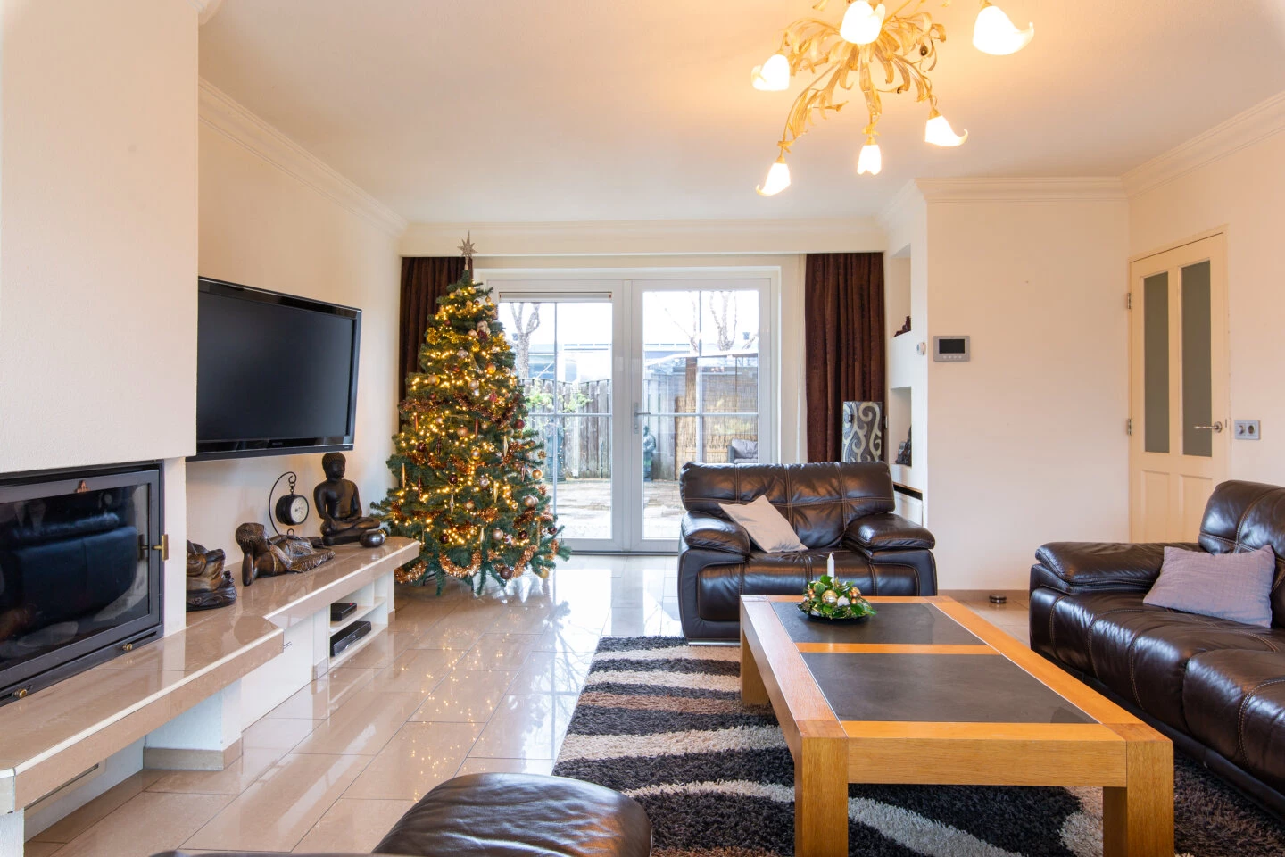 De woonkamer is voorzien van een schuifpui en openslaande deur. De een kijkt uit over de voortuin en de ander over de achtertuin. De woonkamer is ruim te noemen. Er is een mooi geïntegreerde houthaard aanwezig. Het plafond is strak en keurig afgewerkt met een lijst. Vanuit de woonkamer geeft een deur u toegang tot de trap nar de eerste verdieping. Voordat u de trap opgaat kunt u twee lamellendeuren open waarachter u kastruimte vindt en meter