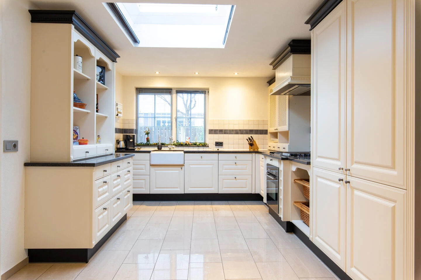In deze keuken kan de thuis kok zijn hart ophalen. Er is veel werkruimte, opbergruimte en er is een onder andere Boretti 4-pits gasfornuis met bakplaat aanwezig. Er is een lichtkoepel met hor aanwezig om de keuken te voorzien van extra daglicht.