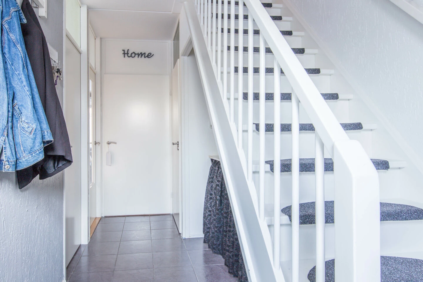 Je parkeert je auto veilig op eigen terrein in de voortuin en komt binnen via de entreehal met toegang tot de deels betegelde toiletruimte met fonteintje, meterkast, trapopgang, en woonkamer. De gehele begane grond is voorzien van een laminaat vloer en lichte wanden.