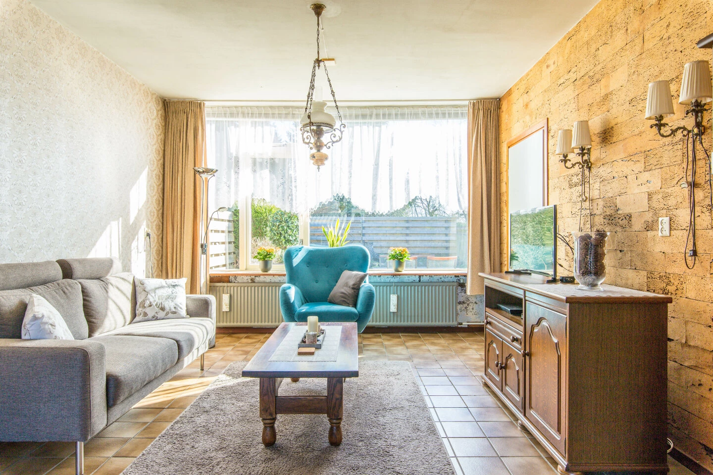 De woonkamer is een sfeervolle leefruimte met heel veel licht door de grote raampartij en zicht op gezellige tuin.