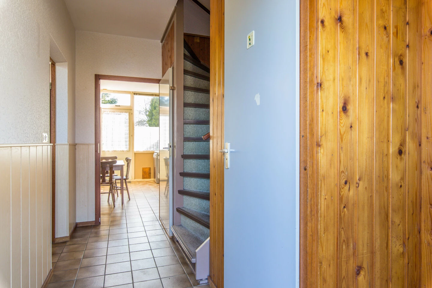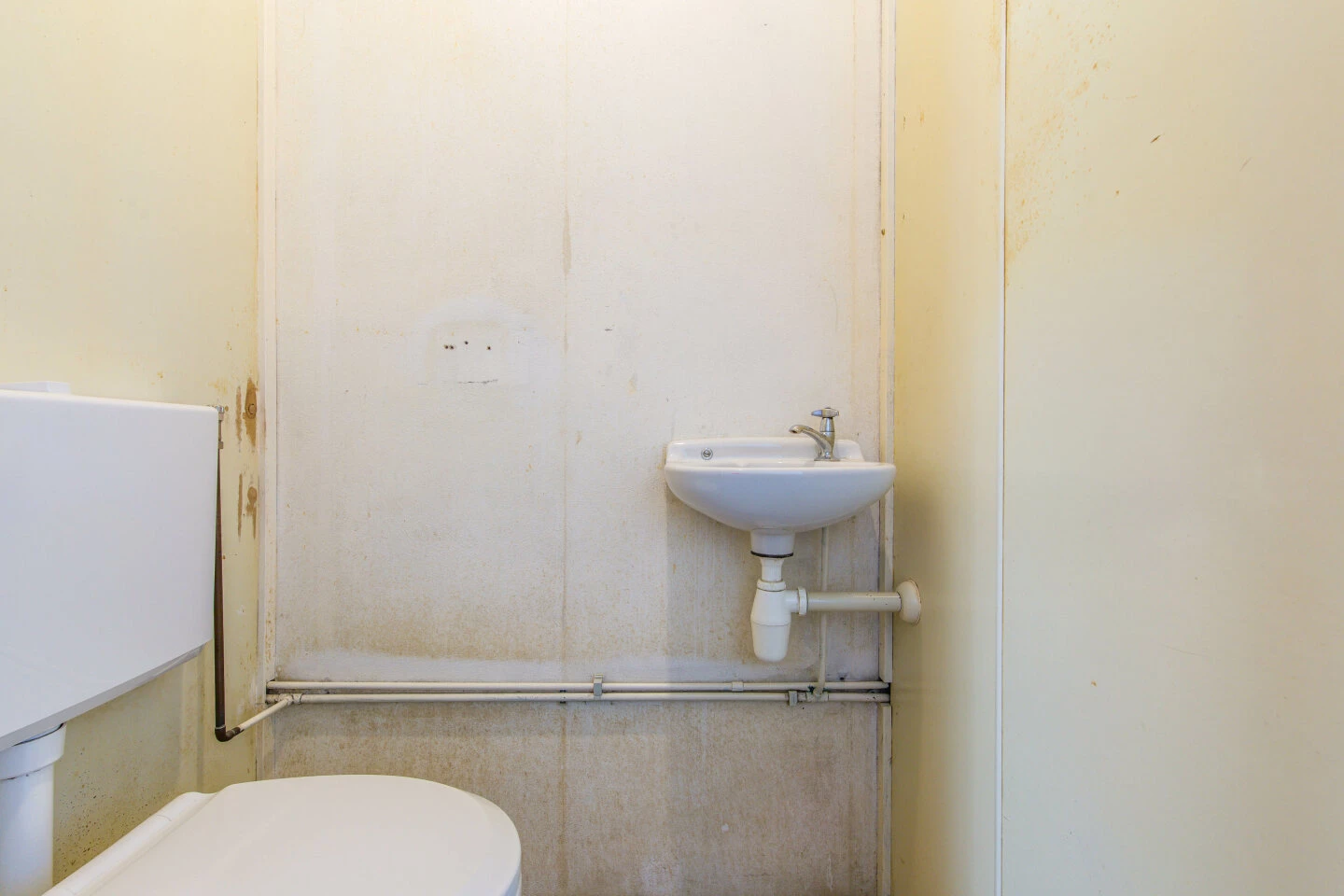 De badkamer dient gemoderniseerd te worden. De vloer en wanden zijn voorzien van lichte tegels. Je treft hier een douche, toilet, wastafel en de wasmachine aansluiting. Praktisch is het smalle raam dat voor extra daglicht en ventilatie zorgt.