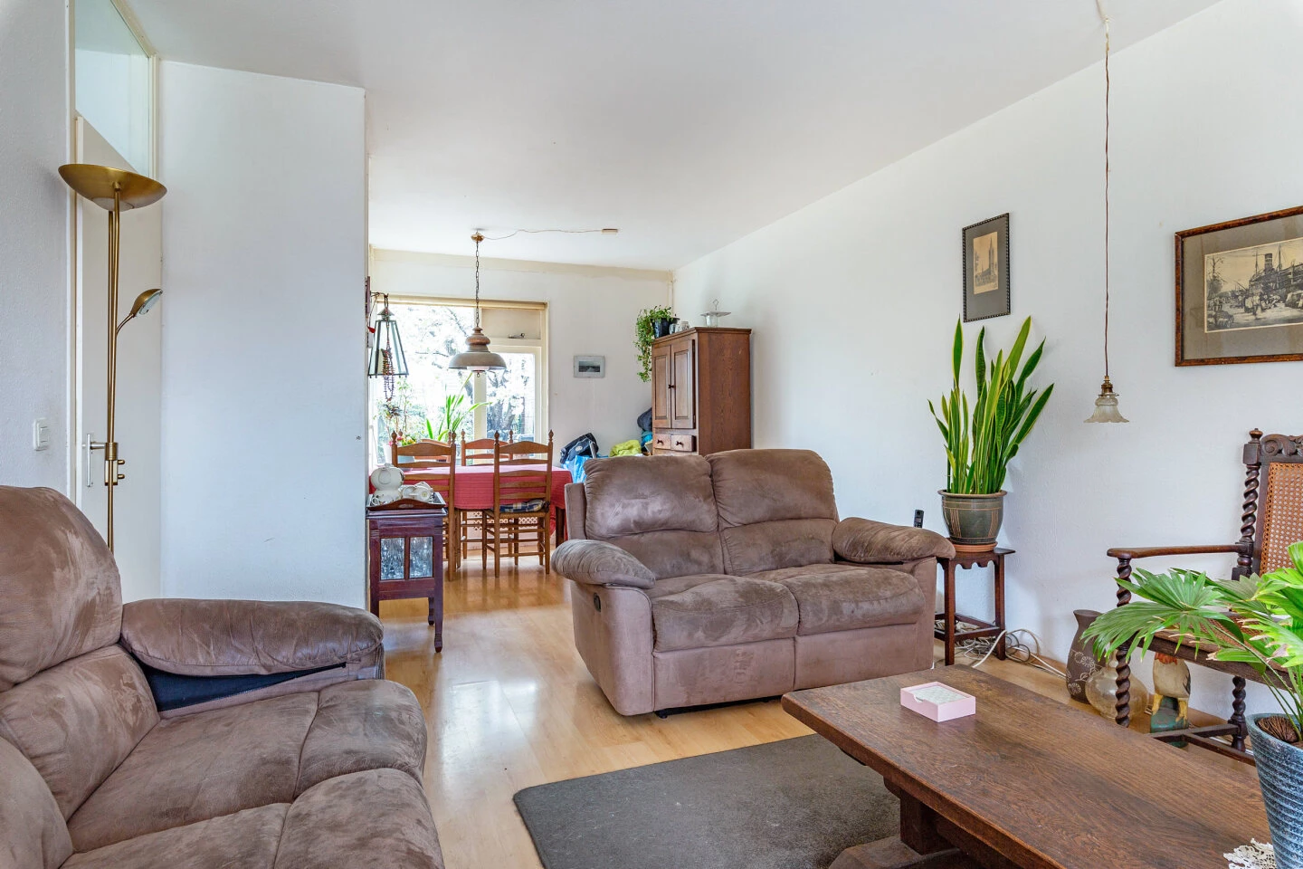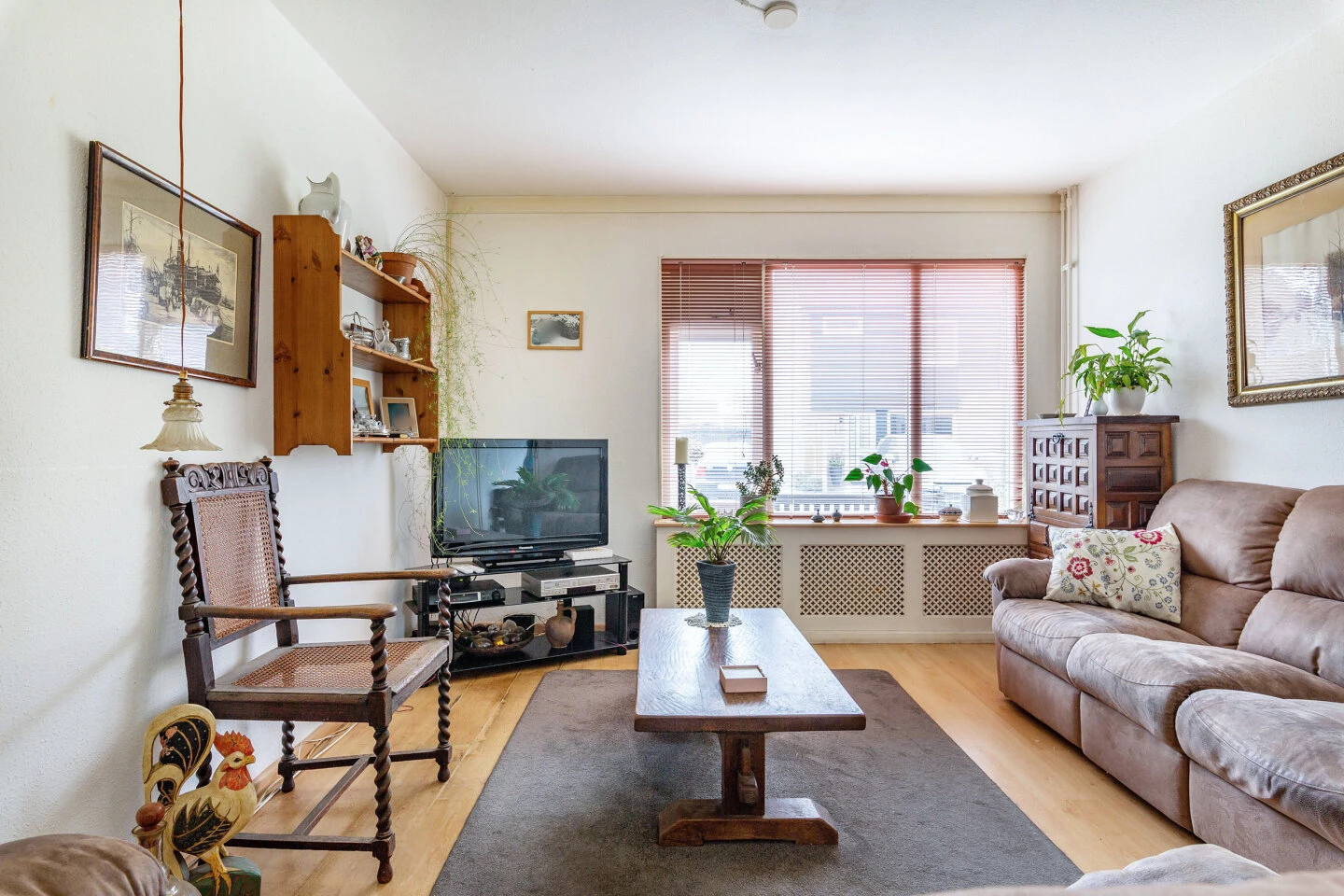 De woonkamer is een sfeervolle leefruimte met heel veel licht door de grote raampartij en zicht op gezellige straat.