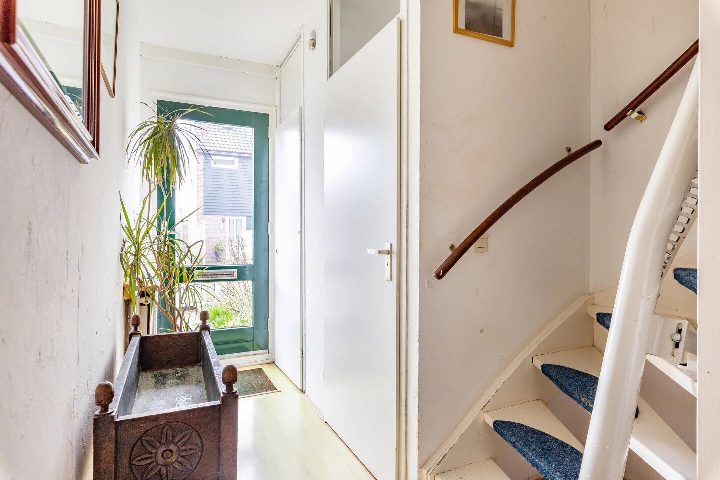 Je betreedt de woning via de entree met toegang tot de toiletruimte met fonteintje, meterkast, trapopgang, en woonkamer. De gehele begane grond is voorzien van een laminaat vloer en lichte wanden.