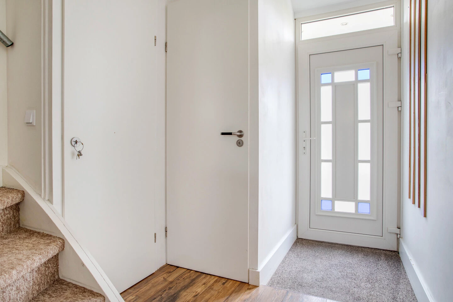 Je betreedt de woning via de entree met toegang tot de vernieuwde toiletruimte met fonteintje, meterkast, trapopgang, trapkast en woonkamer. De gehele begane grond is voorzien van een keramische parketvloer met vloerverwarming en lichte wanden.
