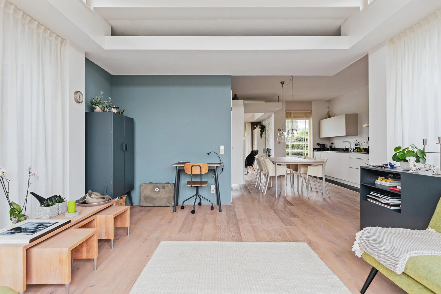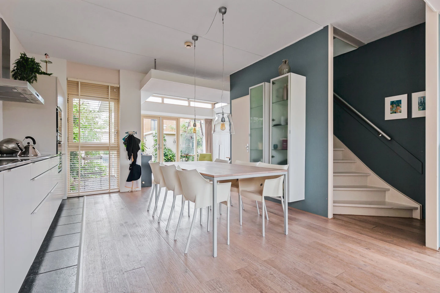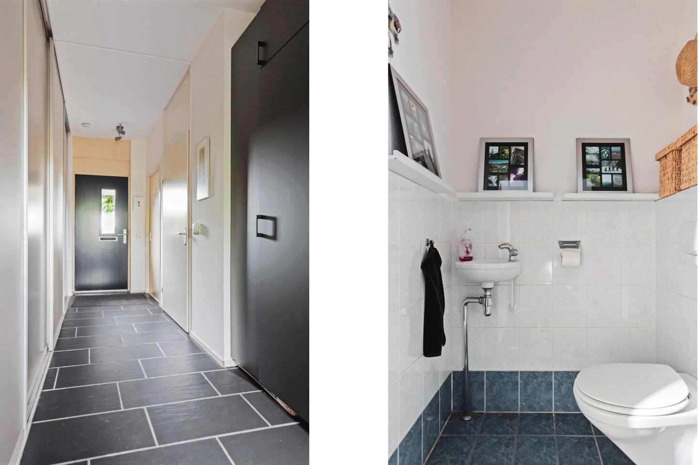 entree, zeer ruime hal, voorzien van veel bergruimte en een inbouwkast met extra koel- vriescombinatie. Net toilet met hangcloset. Toegang tot de flink bemeten centrale woonkeuken met royaal ruimte voor een grote eetkamertafel. De keuken is van 2017 en voorzien van koel- vriescombinatie, oven, magnetron, grote inductiekookplaat en een vaatwasser. Aan de voor- en achterzijde van de keuken bevinden zich de beide woonkamers met hoge plafonds en grote raampartijen. Aan de achterzijde bevinden zich dubbele openslaande deuren naar de tuin. In 2018 werd een nieuwe pelletkachel geplaatst, die op een energiezuinige manier heerlijke warmte geeft . Fijn veel daglicht in dit huis!