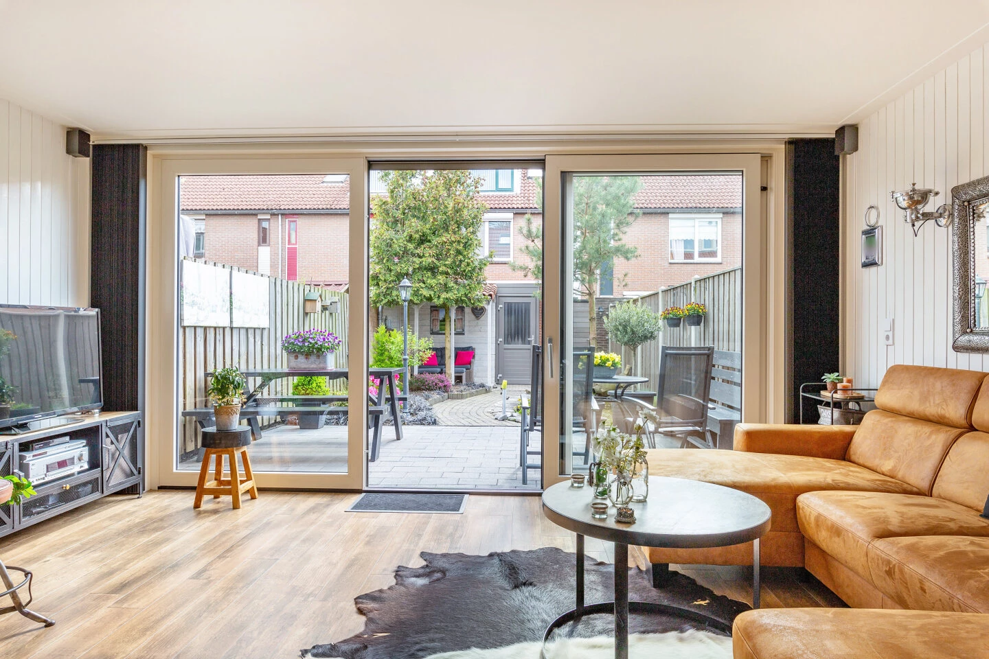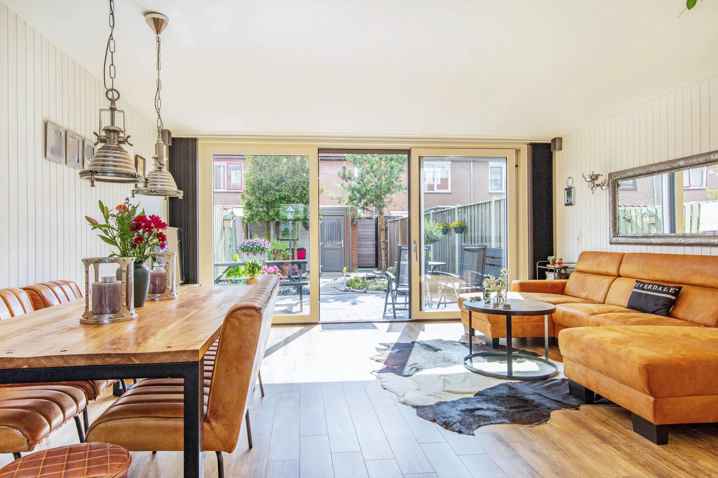 De woonkamer is een sfeervolle leefruimte met heel veel licht door de grote raampartij en zicht op de gezellige tuin. De tuin is te betreden via de schuifpui.
