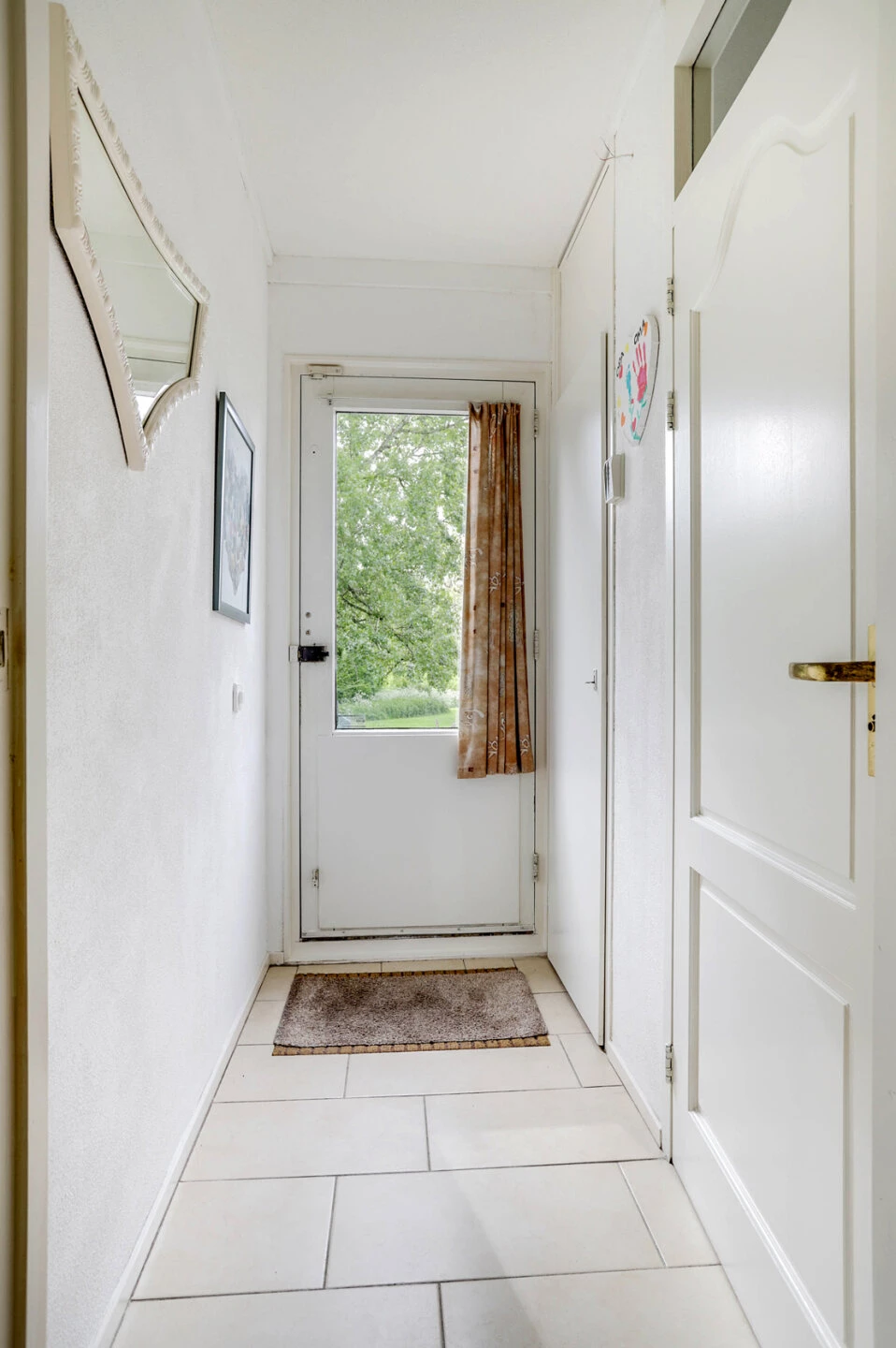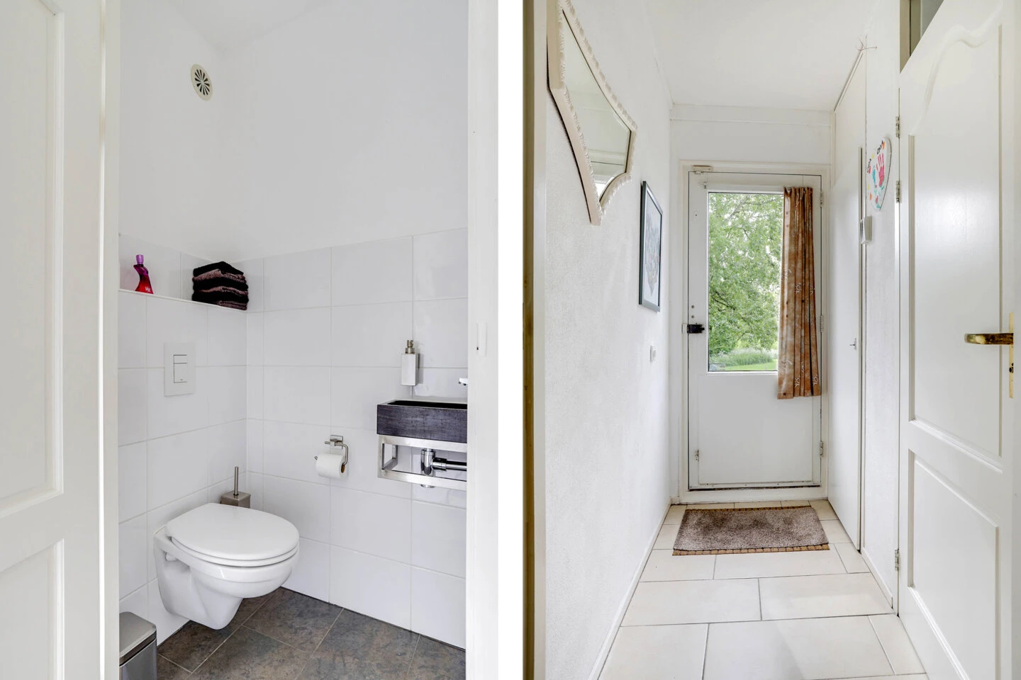 Je betreedt de woning via de hal met toegang tot de meterkast, betegelde moderne toiletruimte met fonteintje, woonkamer en keuken. De woonkamer is voorzien van vloerverwarming en plavuizen en biedt een vrij uitzicht aan de voorzijde op het groen.