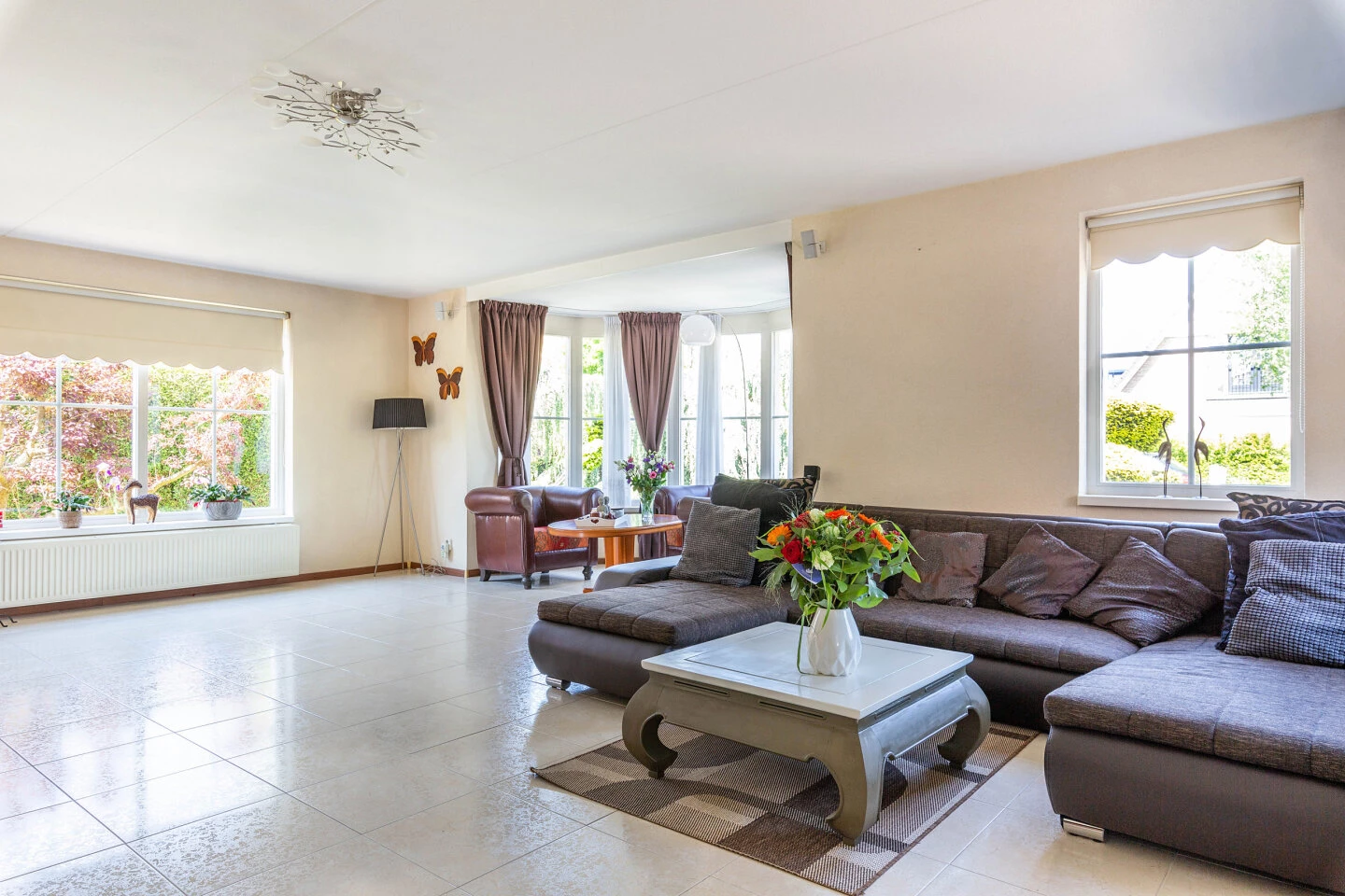 De ruime oprit geeft toegang tot de aangebouwde stenen garage. Entree via de lichte hal met toilet, meterkast en vaste trap naar de eerste verdieping. Van hieruit kom je in de zeer ruime lichte woonkamer met half open keuken, hier is voldoende ruimte voor de eetkamer tafel of voor een zithoek. Aan de tuinzijde is een extra keuken met uitzicht over de tuin, hapjes en drankjes zijn zo binnen handbereik! De gehele begane grond is voorzien van een plavuizenvloer met vloerverwarming. De woonkamer is heel licht door de vele raampartijen . Aan de voorzijde is een ruime erker en vanuit de keuken heb je zicht op de mooie groene achtertuin. De tuin is te betreden via de openslaande tuindeuren en via een loopdeur vanuit de extra keuken. De half open keuken is uitgevoerd in hout, deze heeft veel opberg ruimte en is voorzien van alle moderne inbouwapparatuur zoals kookplaat, oven, afzuigkap, koel/vriescombinatie en vaatwasser.