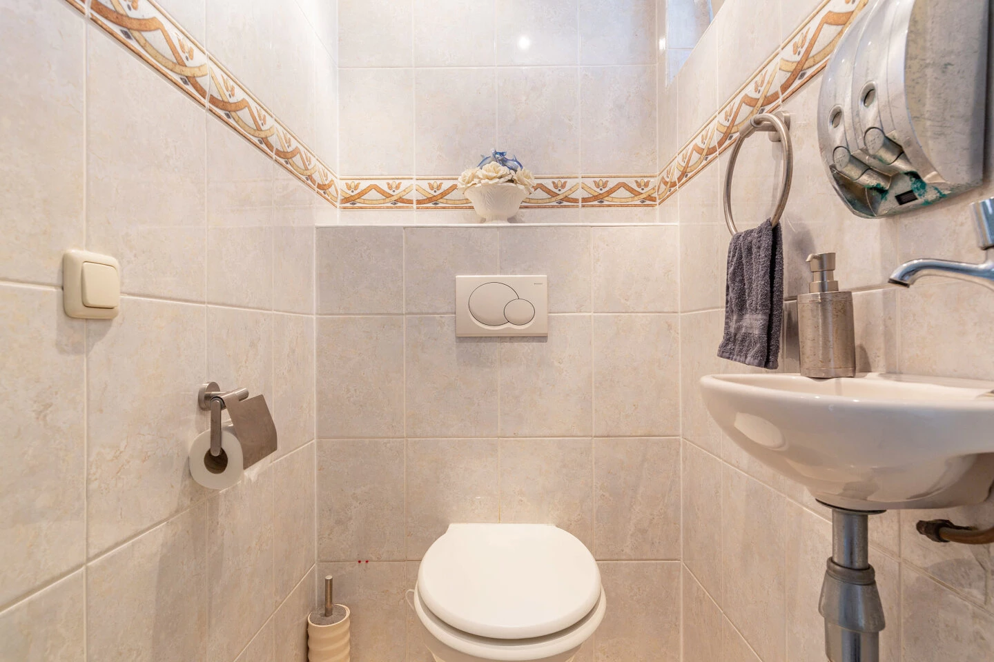 De badkamer is modern en voorzien van vloerverwarming, een inloopdouche, dubbele wastafel, zwevend toilet en designradiator. Veel kastruimte en raam voor natuurlijke lichtinval en ventilatie. Tevens vind je hier de wasruimte met wasmachine en droger aansluiting.