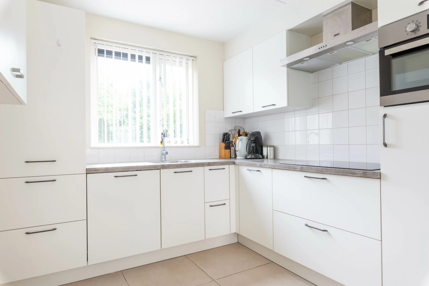 Aan de voorzijde bevindt zich de open keuken in L-opstelling, licht van kleur en voorzien van alle moderne inbouwapparatuur zoals inductie kookplaat, oven, afzuigkap, koel/vriescombinatie en vaatwasser. Vanuit de woonkamer heb je toegang via de openslaande tuindeuren naar de zonnige achtertuin op het zuiden.