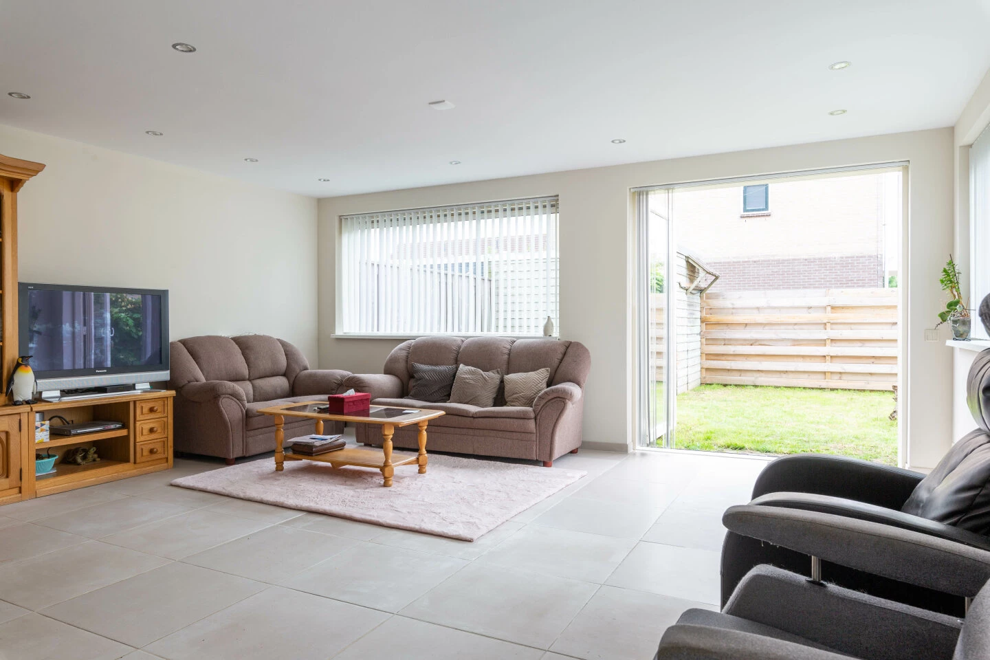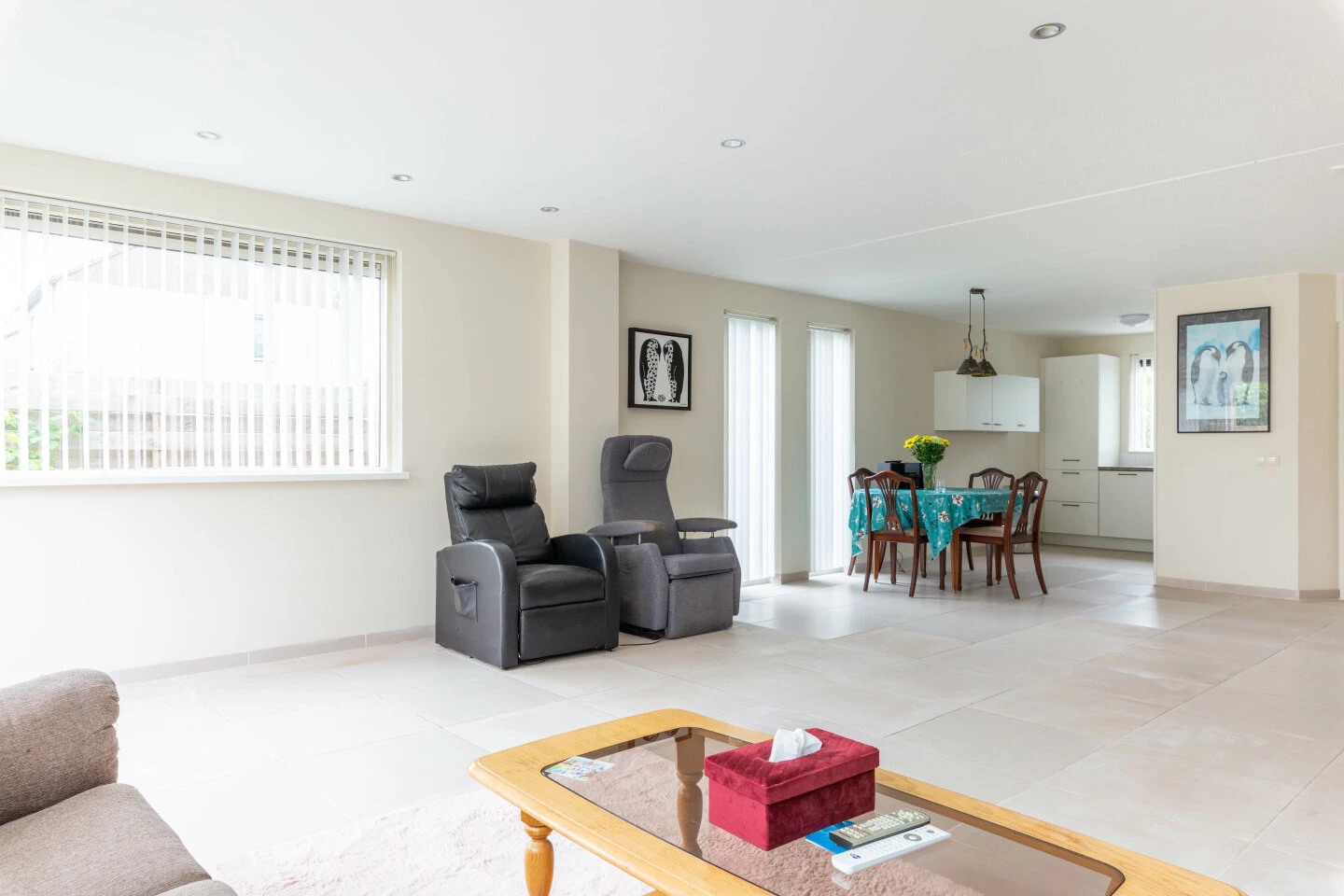 Via de hal kom je de woning binnen, hier is de meterkast en de betegelde toiletruimte met fonteintje. De woonkamer is voorzien van plavuizen met vloerverwarming en is ruim met openslaande deuren naar de tuin.