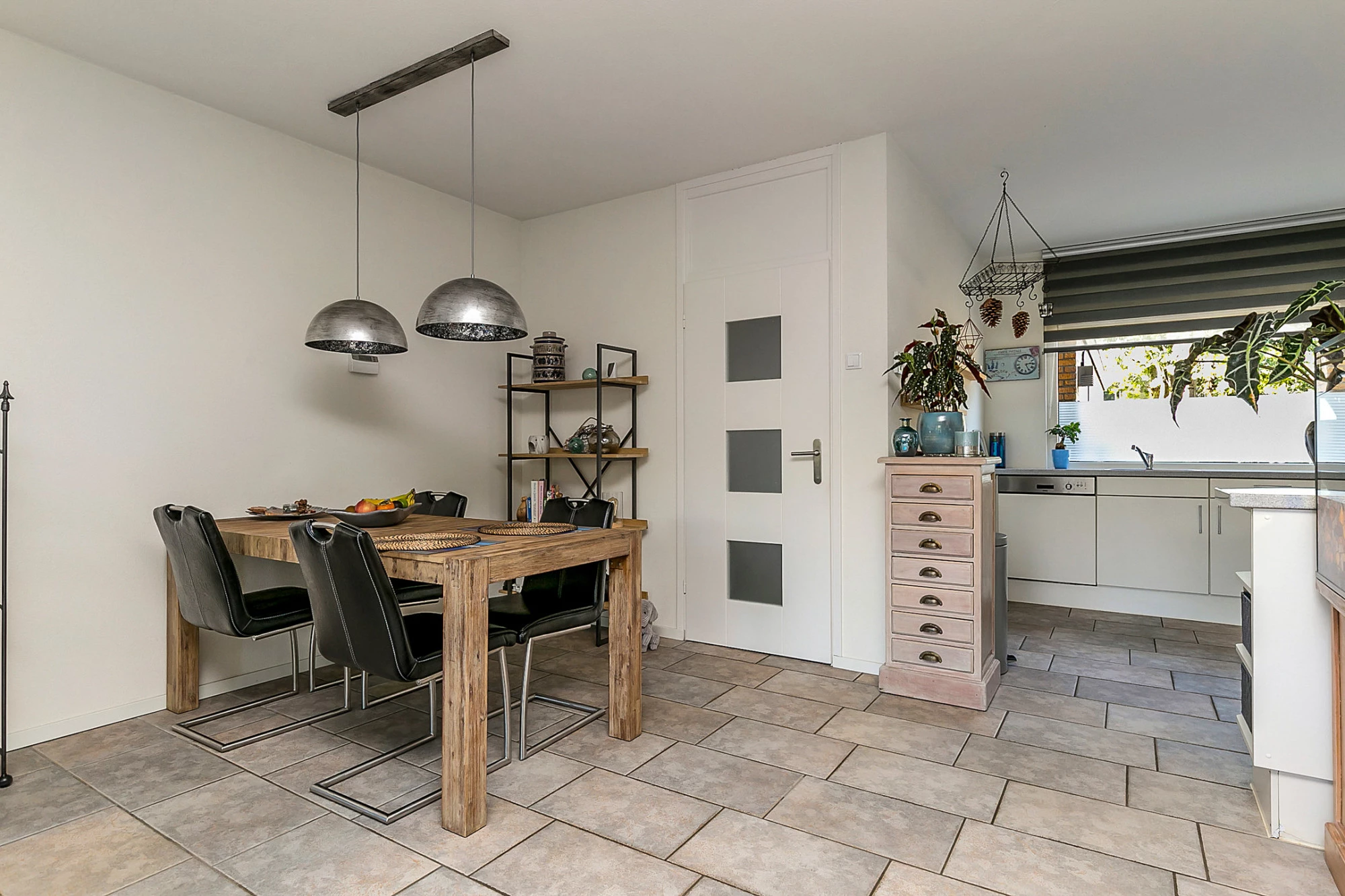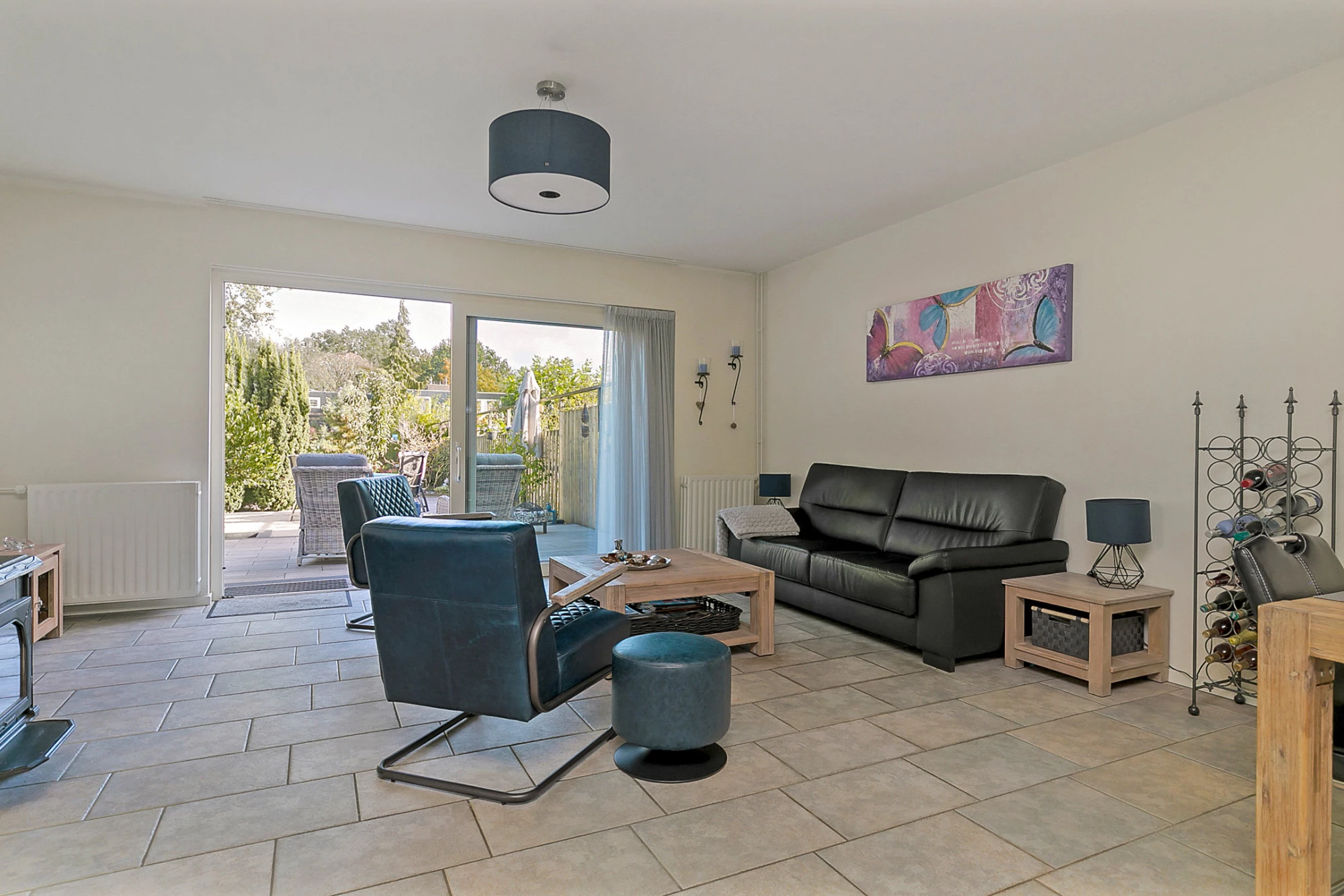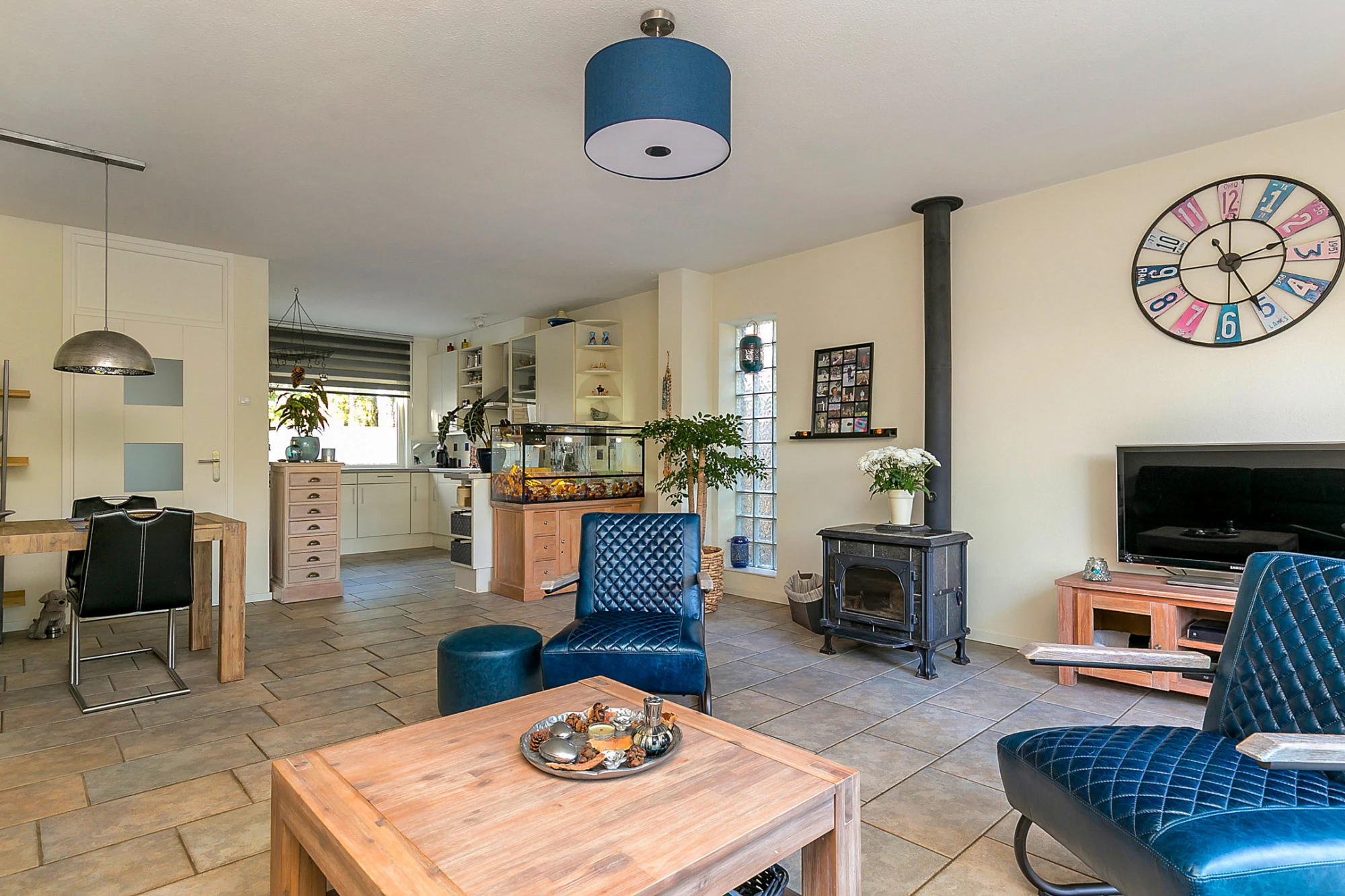 Indeling: entree, ruime hal met net toilet en slimme wasmachine-opstelling. Toegang tot de garage aan de voorzijde. Brede woonkamer met zijraam en kunststof schuifpui over bijna de hele breedte, lichte tegelvloer, houtkachel en -wat oudere maar nette- keuken aan de voorzijde van het huis. Mooi zicht op de verzorgd aangelegde achtertuin.