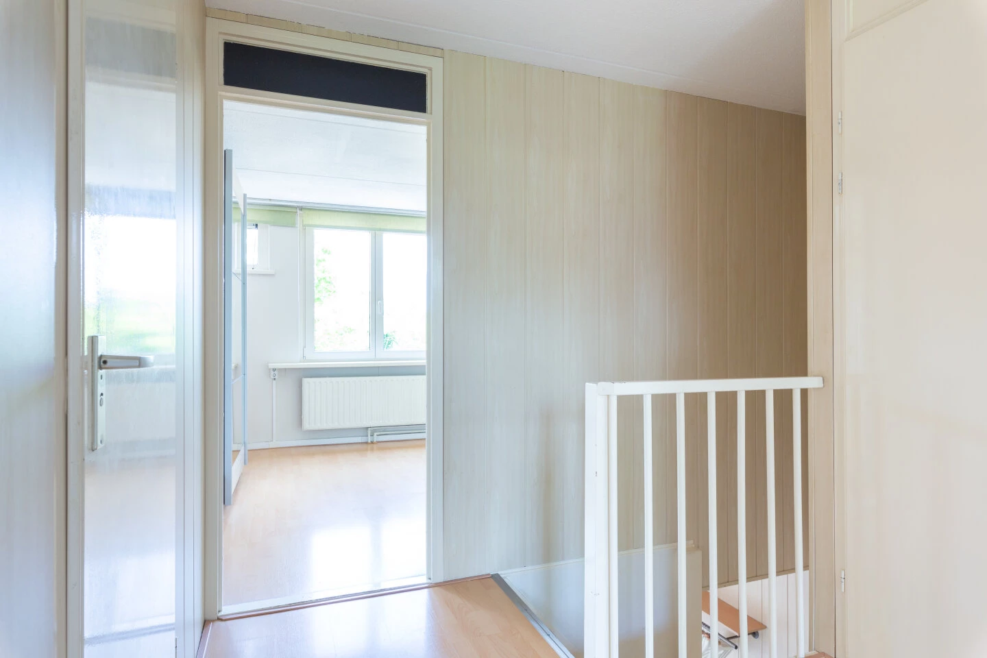 Hier tref je de overloop welke toegang geeft tot de drie slaapkamers, badkamer en een berging waar de wasmachine en droger aansluiting aanwezig is.