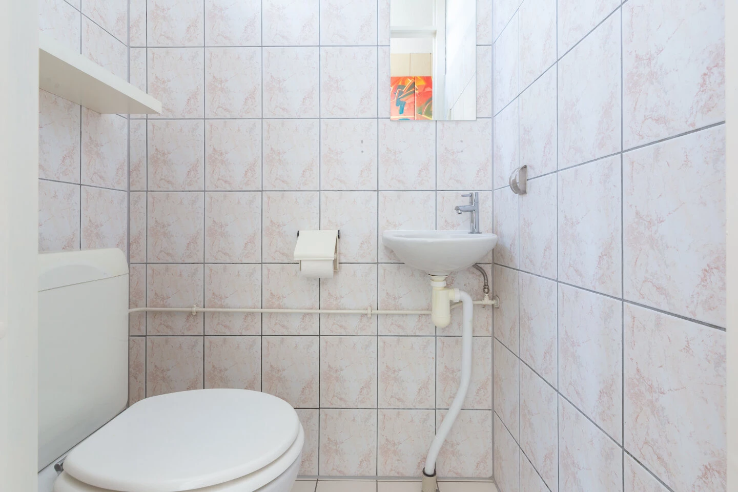 De badkamer is klein maar fijn. De vloer en wanden zijn voorzien van lichte tegels. Je treft hier een douchecabine, toilet en wastafel.